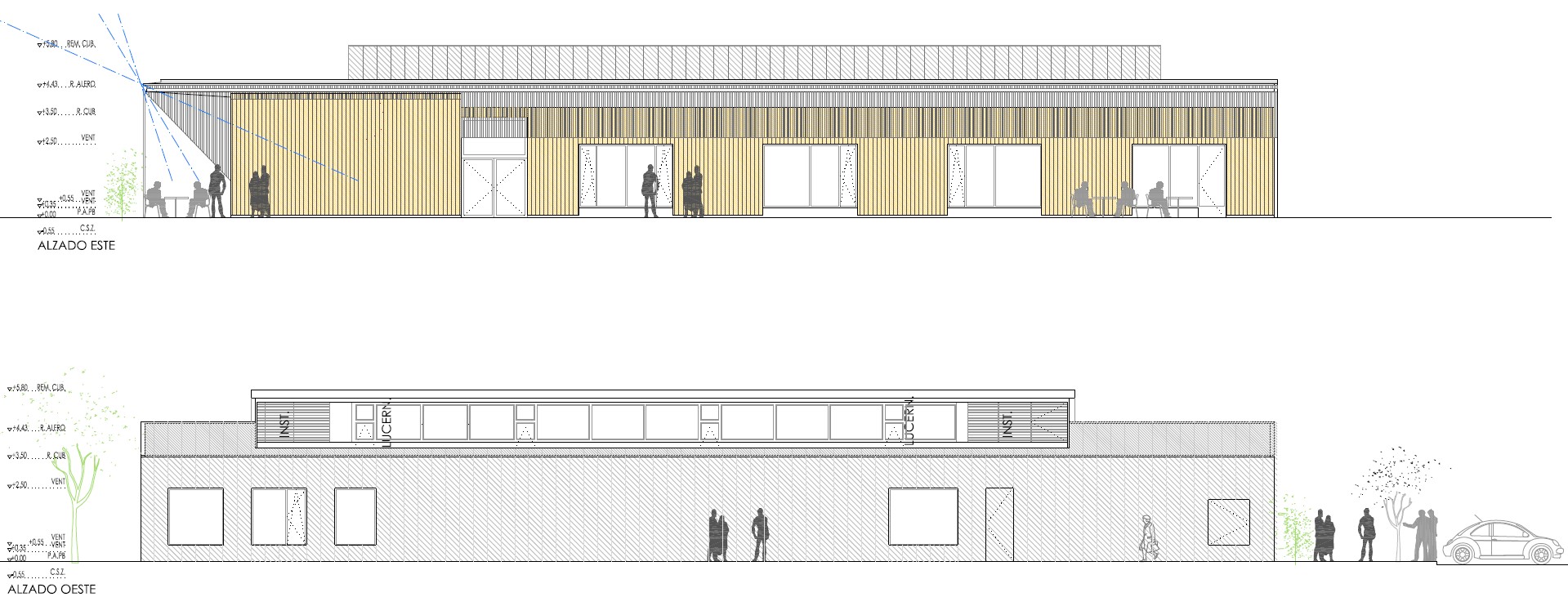 La edificación, con una superficie construida de 380 m2, se sitúa en la parte oeste de la parcela, que, con el eje mayor orientado en dirección norte-sur, tiene una forma sensiblemente rectangular. Esta decisión permite organizar con claridad los accesos peatonales y rodados, concentrándolos hacia el este, lo que favorece la supervisión de la entrada desde el vestíbulo por parte del personal del centro. Pero sobre todo, esta disposición consigue que la edificación se convierta en una barrera protectora frente al viento cierzo dominante, liberando los frentes sur y este para el soleamiento de los espacios polivalentes asociados al porche principal y al jardín exterior.