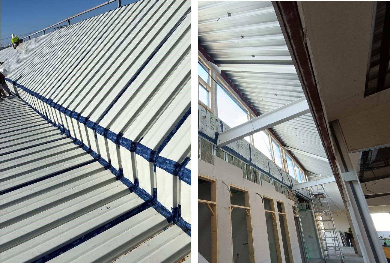 Para los pórticos metálicos regulares se han utilizado perfiles laminados en frío, en tanto que para los voladizos de ambos porches se ha optado por perfiles conformados, sometidos a un proceso de ignifugación con pinturas R-30 –puntualmente R-90– de color blanco, tras lo que se ha procedido al cierre de ladrillos de las fachadas.