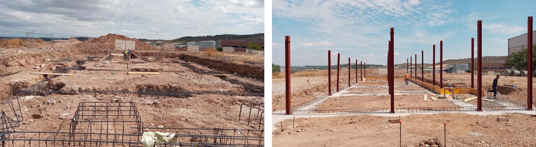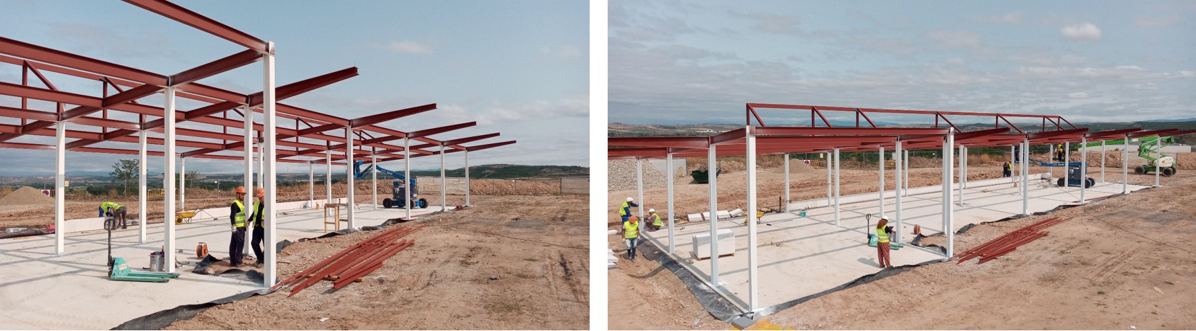 A partir de estos elementos se ha levantado la estructura, compuesta por pilares y vigas metálicas, a la vez que se colocaba una sub-base de encachado de grava sobre lámina de polipropileno y, encima, geotextil y solera de hormigón.