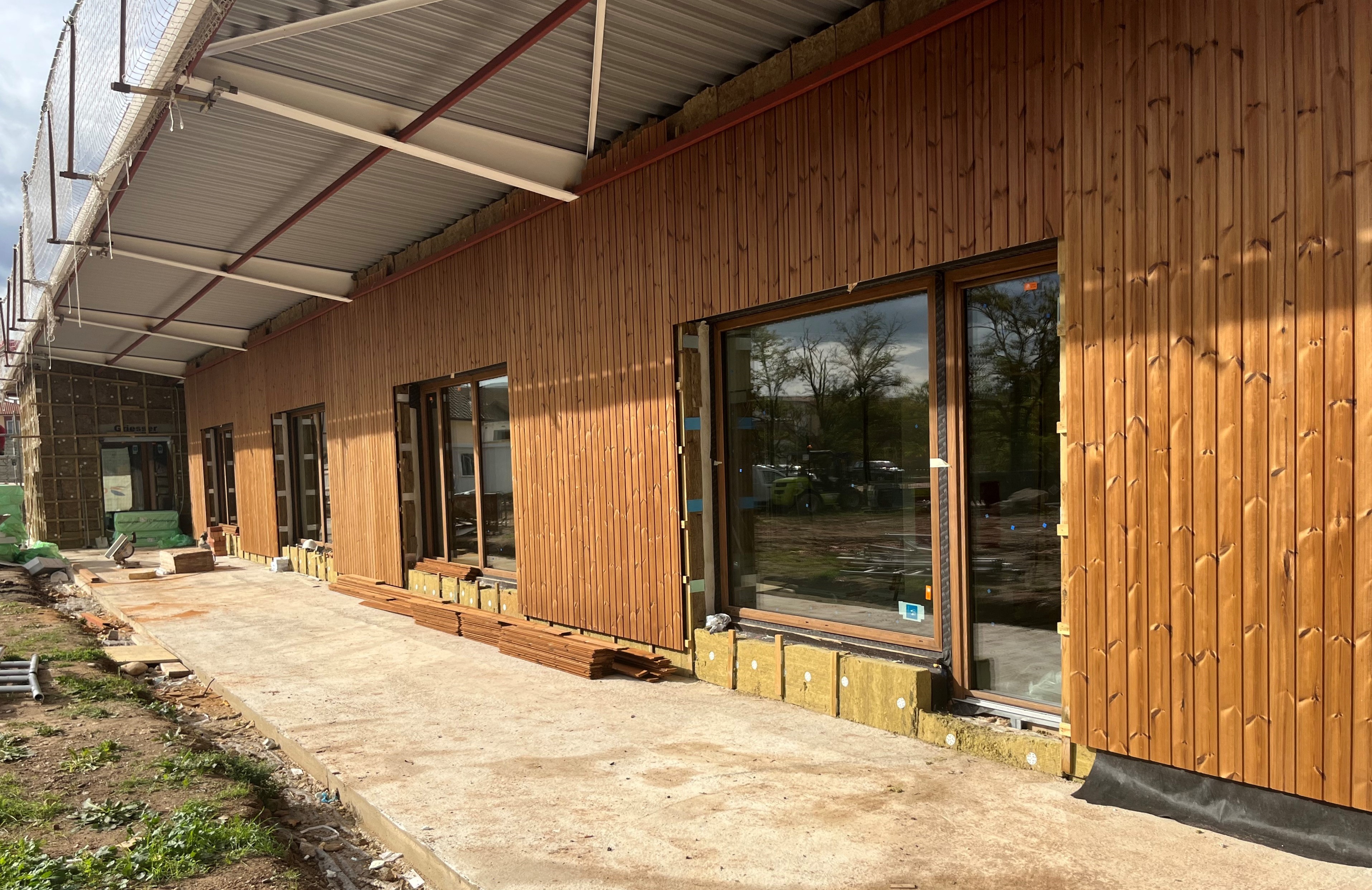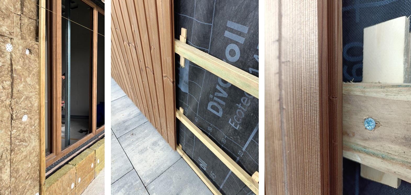 Construcción de la fachada, bajo criterios Passivhaus, con acabado en madera termotratada.