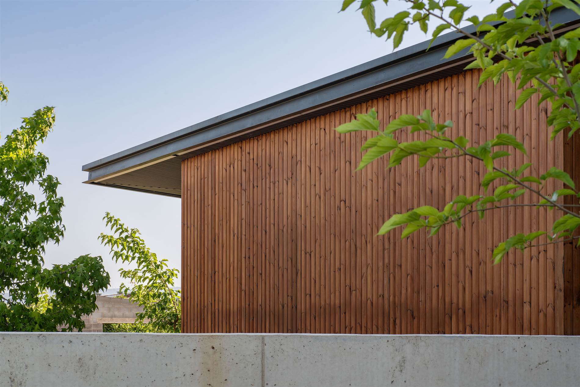 El edificio dispone de dos tipos de fachada: las orientadas a norte y a poniente, acabadas con bandejas metálicas engatilladas –que también materializan la cubierta–, y las acabadas en madera termotratada Lunawood, modelo Flandes, sobre enrastrelado, que, hacia el sur y el este, dotan al edificio de la calidez buscada por el proyecto.
