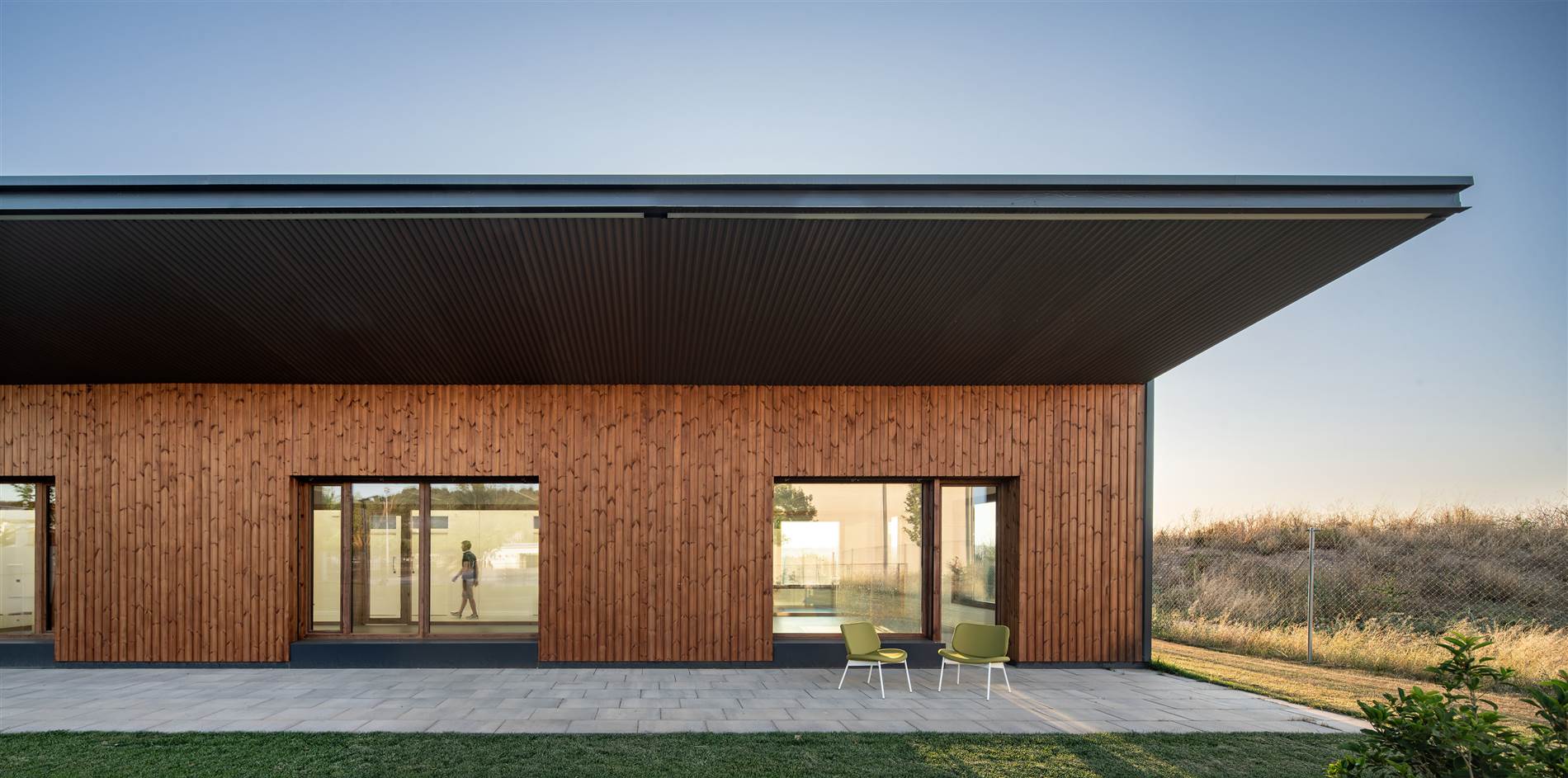 El predominio de la opacidad del revestimiento metálico en el alzado oeste contrasta con la apertura de amplios huecos del alzado sur, en el que se opta por una fachada ventilada de madera termotratada de Lunawood. Fotografía: Josema Cutillas.