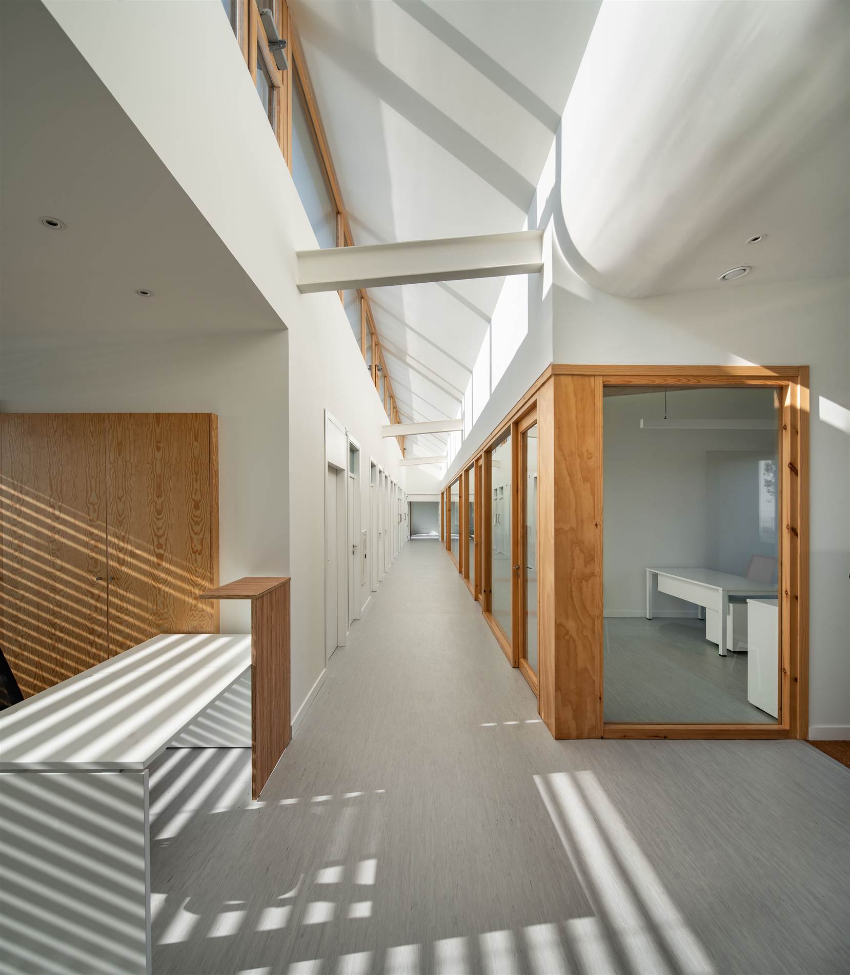 Distribuidor de entrada y corredor de distribución principal, iluminado por el lucernario, con los despachos de administración y enfermería divididos por planos acristalados que permiten la conexión visual con las salas polivalentes, una de las cuales se aprecia al fondo de la imagen. Fotografía: Josema Cutillas.