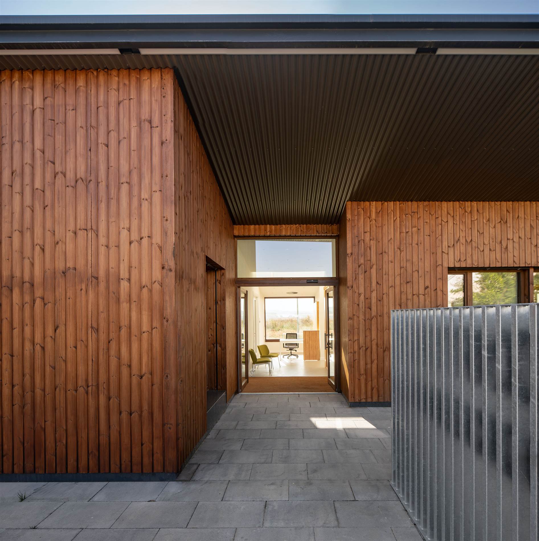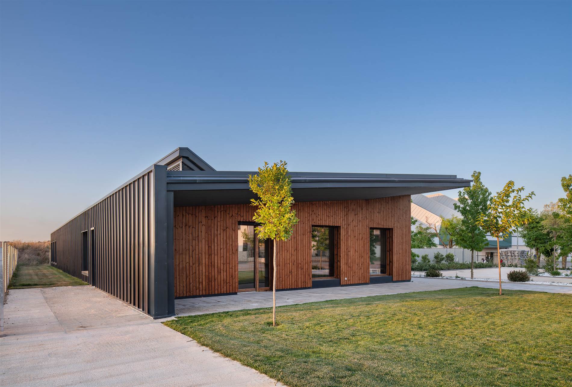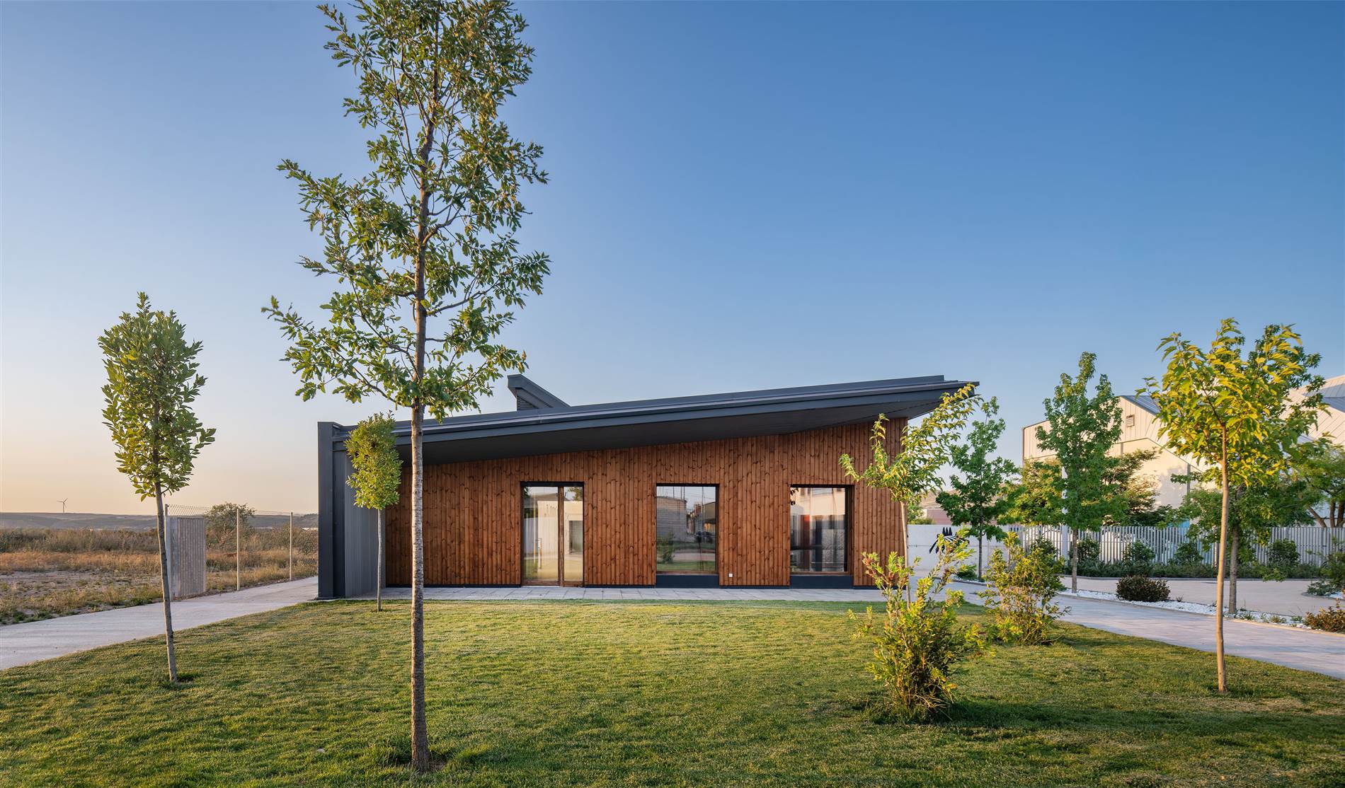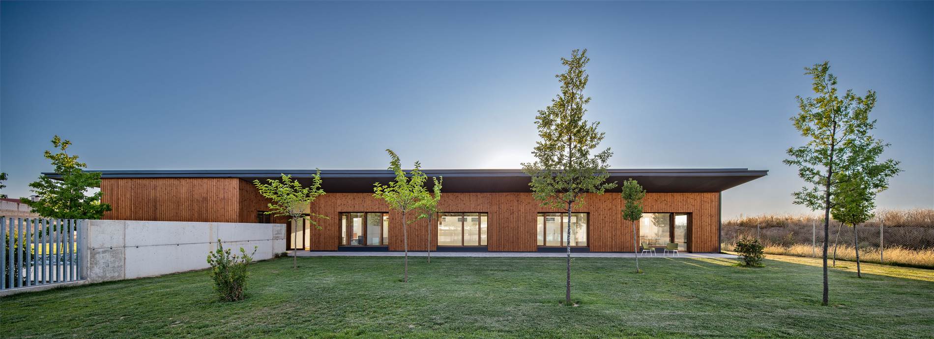 La imagen del edificio, que fue construido en tan solo nueve meses, reproduce con literalidad la reflexión de los autores, que priman con sabiduría la premisa innegociable y básica de toda arquitectura de calidad, que es la buena orientación: el edificio se cierra hacia el noroeste, protegiéndose del azote del cierzo con un revestimiento metálico oscuro, que le dota de un aspecto de envolvente inexpugnable, mientras que la fachada de acceso, recorrida por una rotunda y vibrante piel de madera termotratada de Lunawood, se percibe abierta, acogedora y cálida, invitando a los usuarios a cruzar el umbral y descubrir su interior.