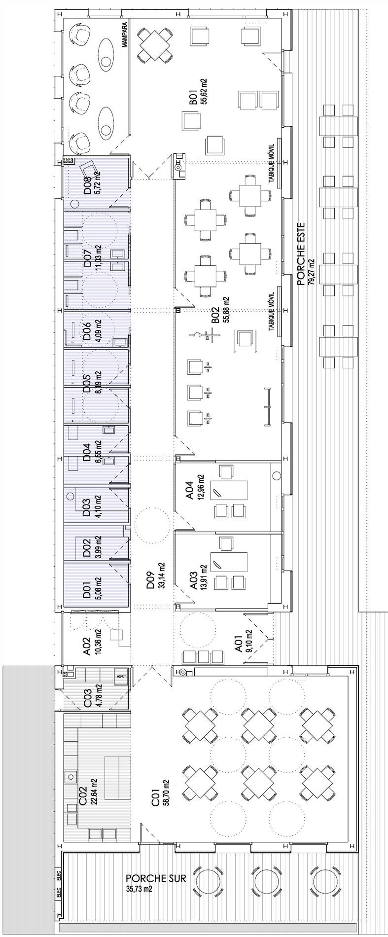 Es el ‘vuelo’ de esta cubierta al superar la línea de fachada lo que conforma tanto el porche principal, al este, hacia el que se orientan las salas polivalentes, como el situado al sur, de menor tamaño, junto al comedor.