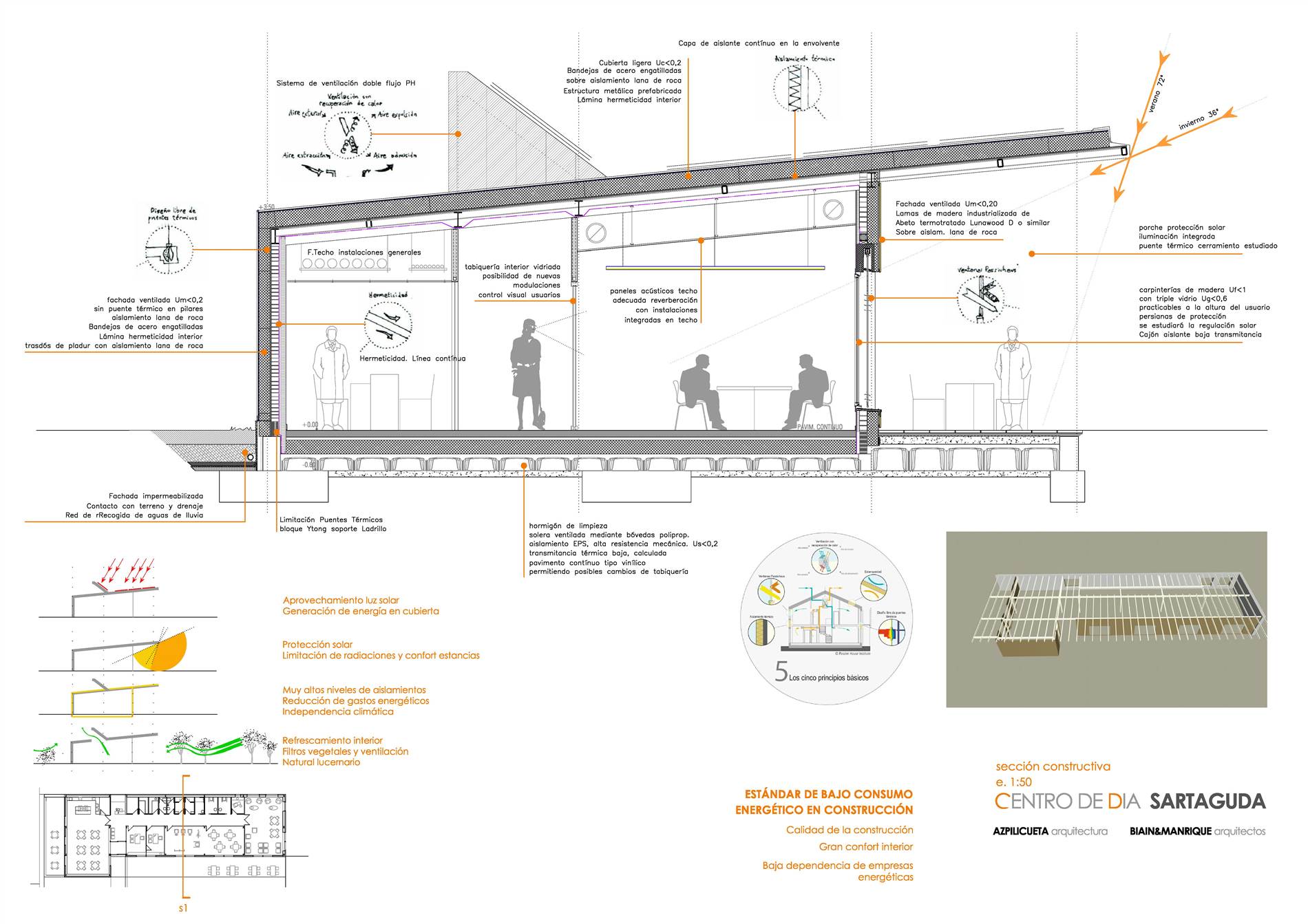 Sección constructiva tipo con resumen de las medidas propuestas por el proyecto para reducir las demandas energéticas del edificio. Ver PDF