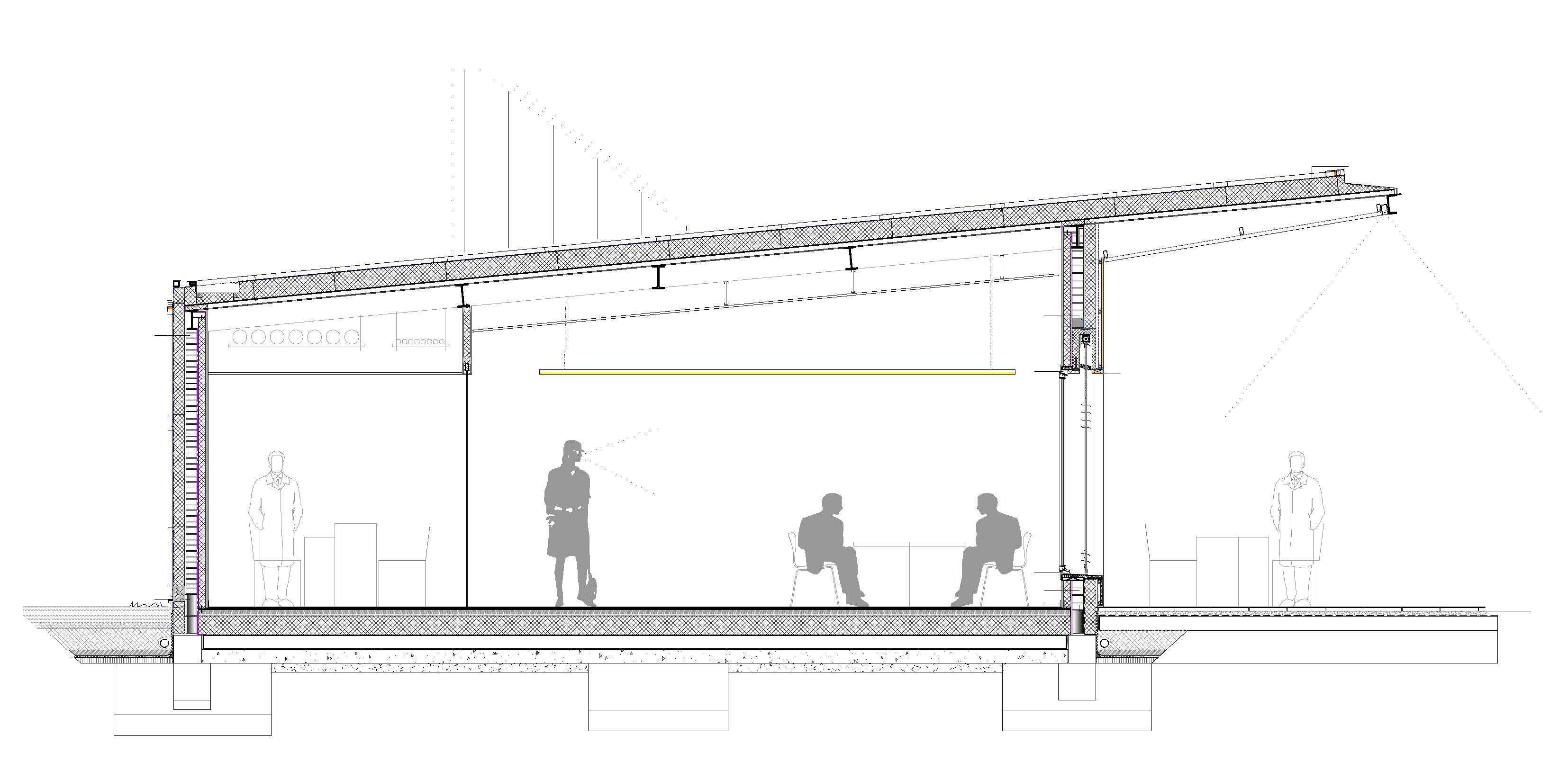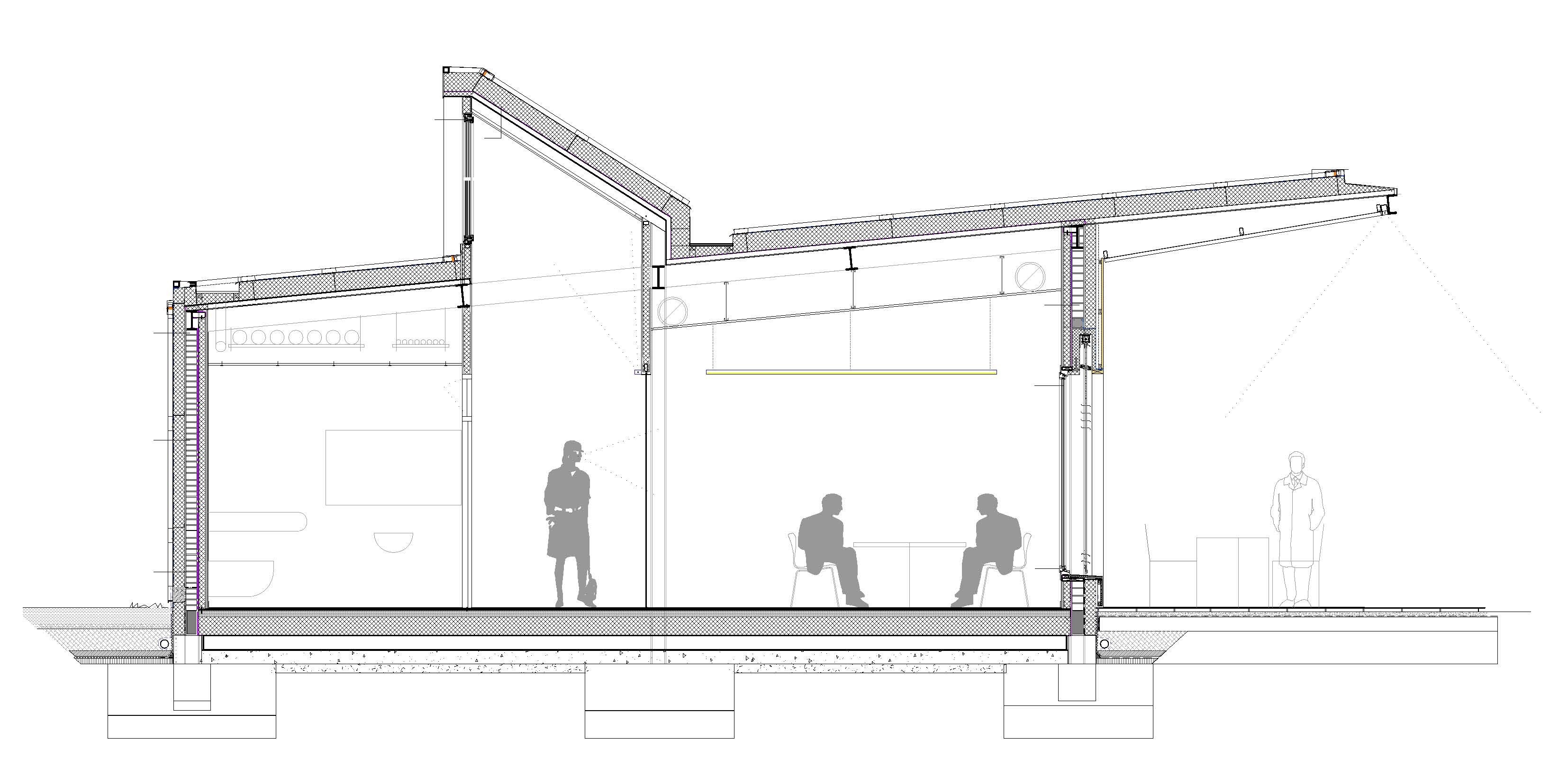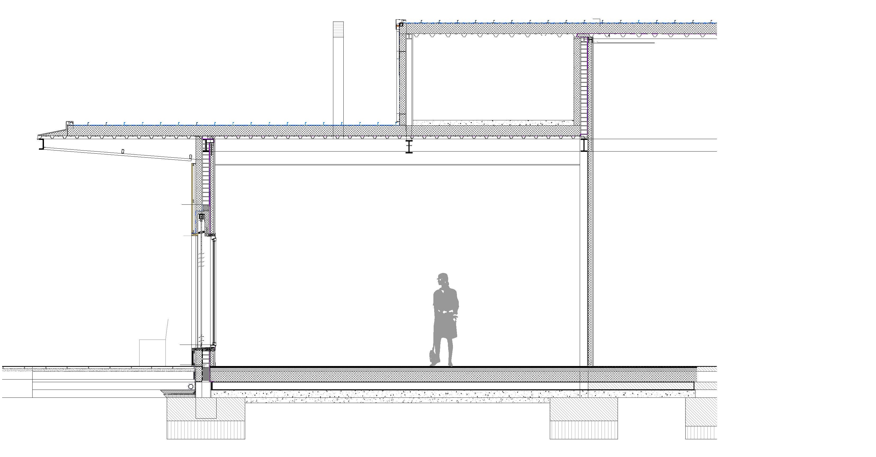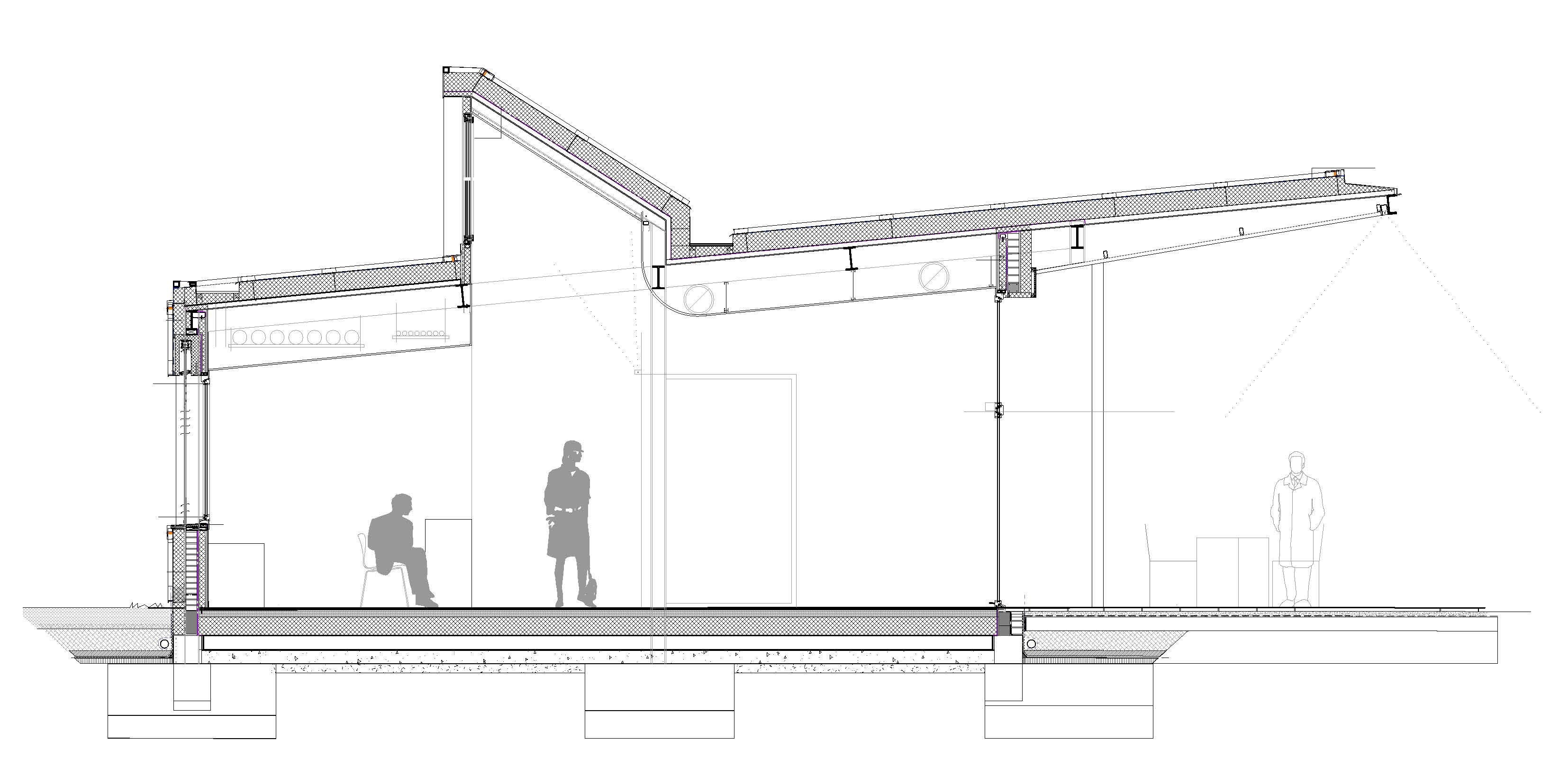 Las carpinterías de madera –mixtas, madera al interior y aluminio al exterior, en las fachadas metálicas– completan el cerramiento exterior de las fachadas. En cuanto a la cubierta, la envolvente metálica asciende desde la fachada oeste y conforma una cubierta ligera con acabado exterior de panel metálico engatillado sobre cubierta tipo deck, ensamblada en seco.