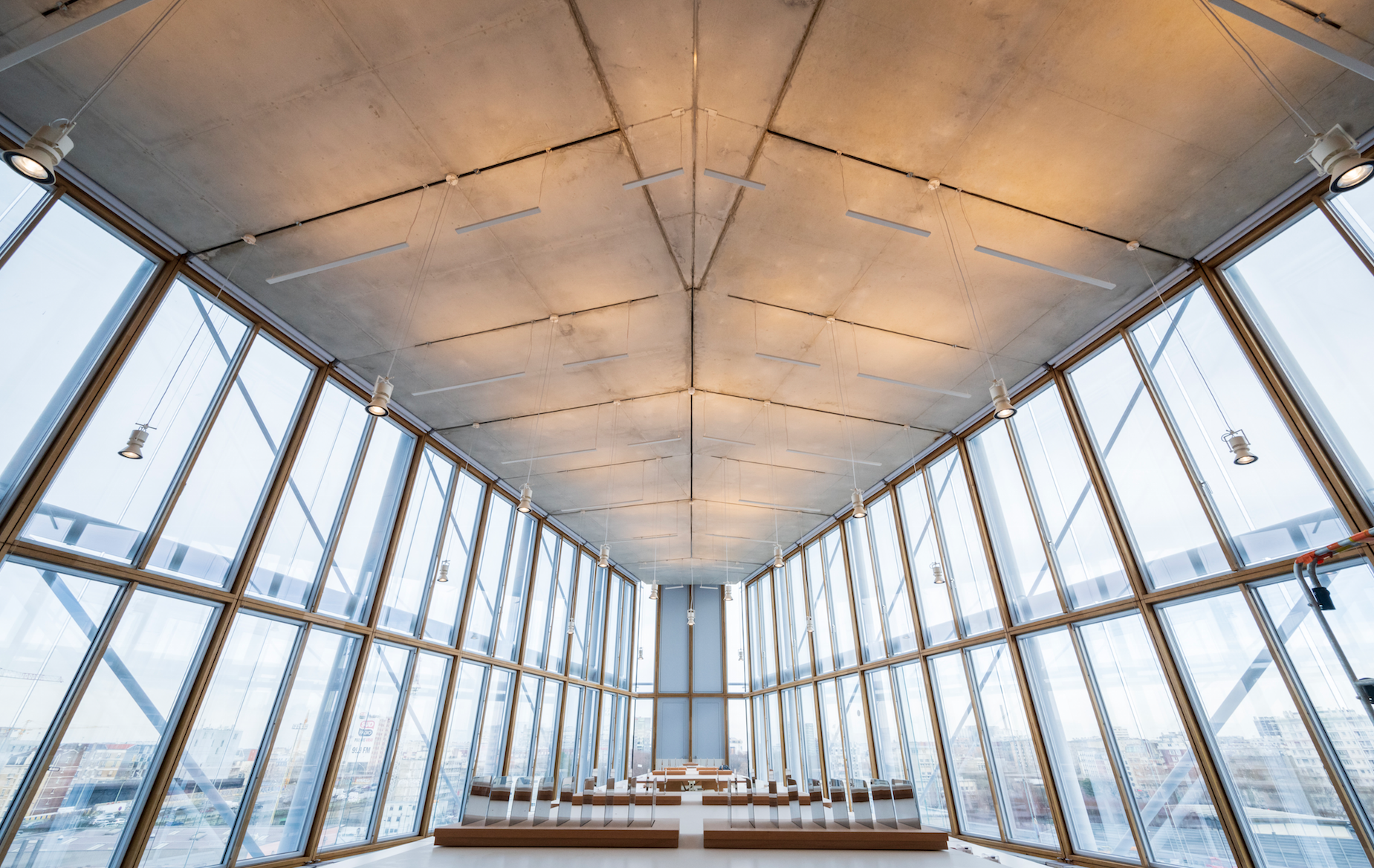 Foto: H. Hillyer.Este planteamiento se desestimó durante el estudio de viabilidad, quedando únicamente la pieza  más plana y opaca como revestimiento cerámico de la superficie del  cerramiento.  La iluminación se solucionó por medio de una serie de lucernarios situados sobre el edificio.
