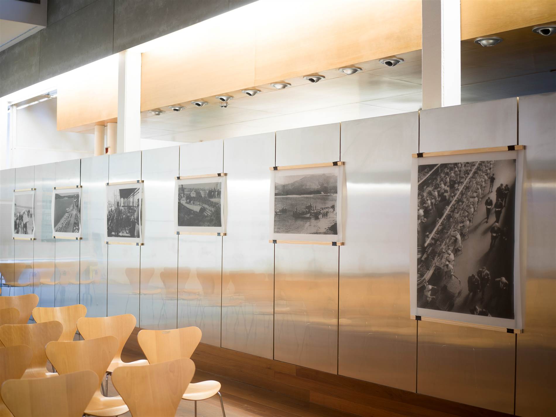 Junto a estos trabajos, la instalación “GALICIA S.XX Crónicas del mar” se acerca a la temática específica del congreso sobre “Arquitecturas marítimas”, poniendo el acento en la intensidad de la vida en esta zona intermedia entre el mar y la tierra. Luz Paz Agras, comisaria de la muestra y profesora de la ETSAC, apunta que, en el espesor de la línea de trazo gordo de la costa atlántica, la arquitectura moderna ha sido escenario de hechos inseparables de la historia, a los que aluden una serie de fotografías procedentes de diversos archivos: las infraestructuras y arquitecturas del ocio, la promesa del viaje, las luchas obreras en los astilleros o la deuda de las fábricas conserveras con el trabajo de las mujeres.