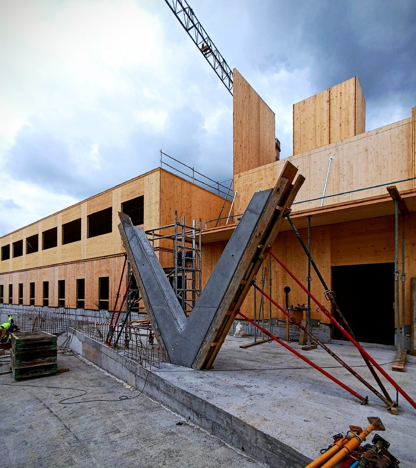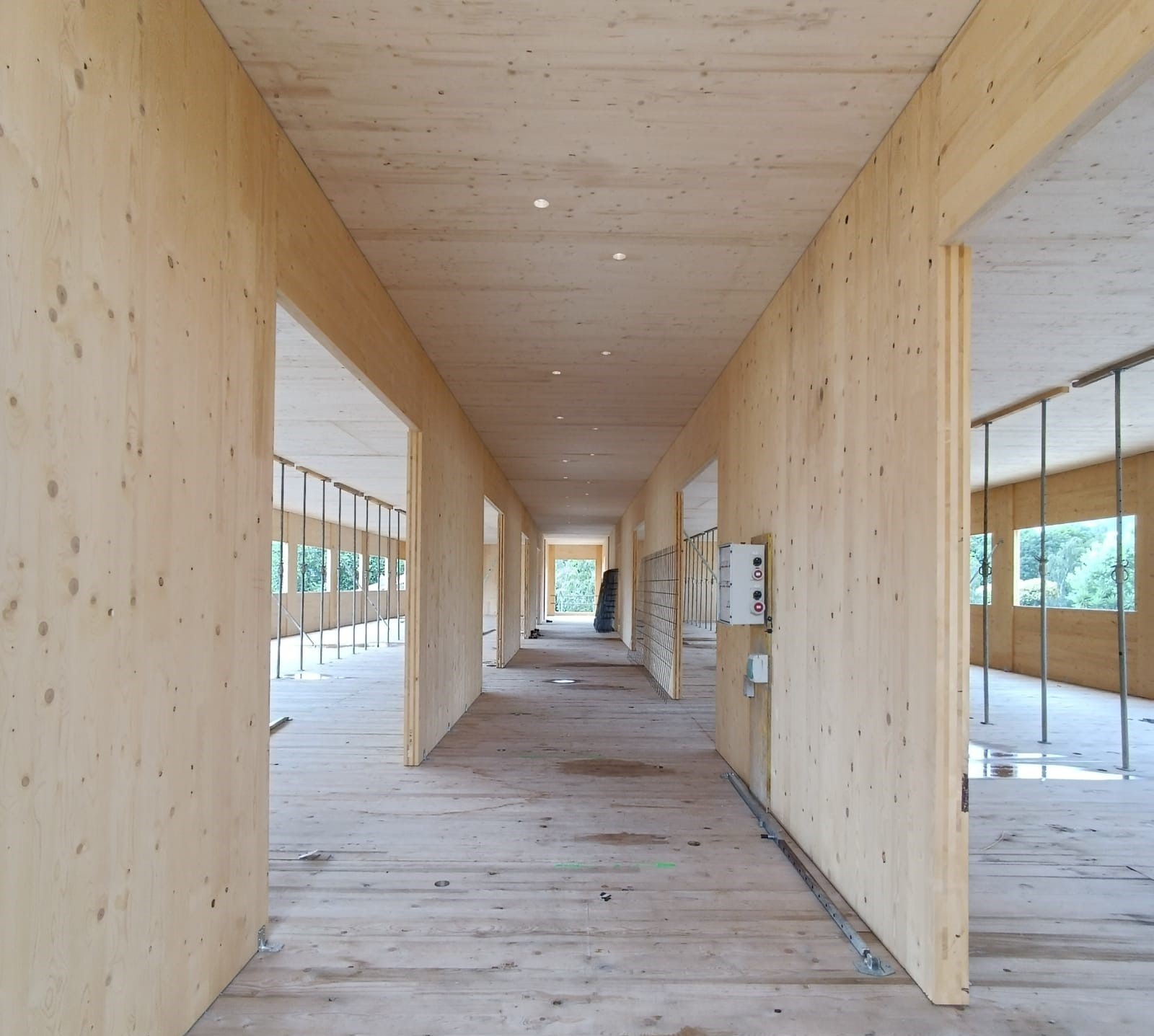 Entre la subestructura y el muro portante se dispone un aislamiento continuo de lana de roca de doce centímetros de espesor, que actúa como elemento principal de control térmico y acústico. Este aislamiento se protege interiormente mediante una lámina de control de vapor que regula las condensaciones derivadas del uso docente intensivo del edificio. La hoja interior se resuelve con muros de carga de paneles de CLT, que aportan inercia y estabilidad dimensional, reducen el peso estructural frente a soluciones de hormigón y permiten una obra seca, rápida y con bajas emisiones asociadas.