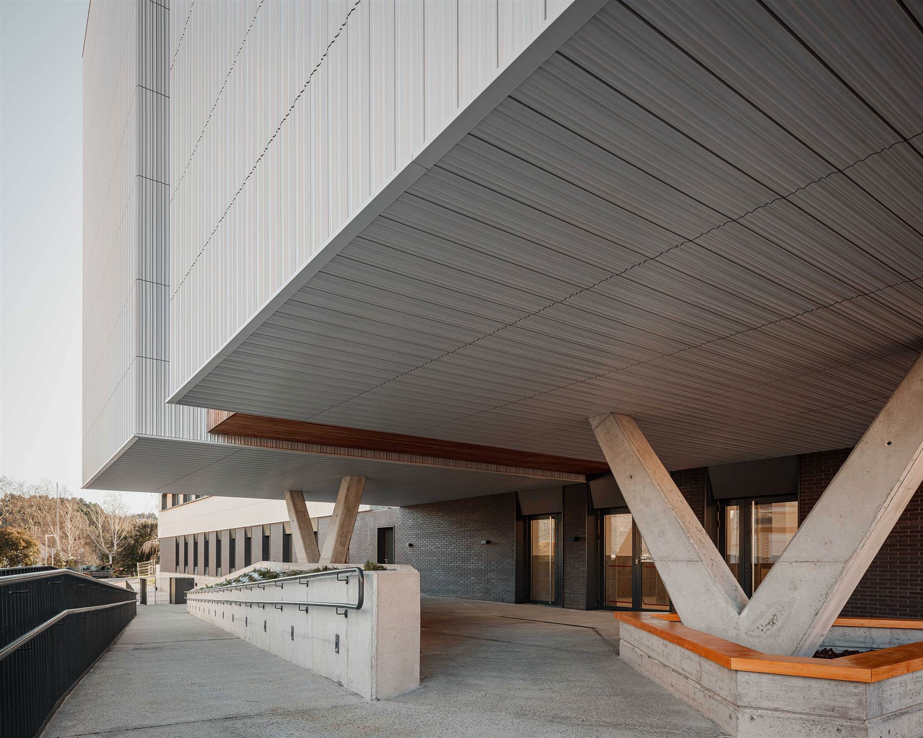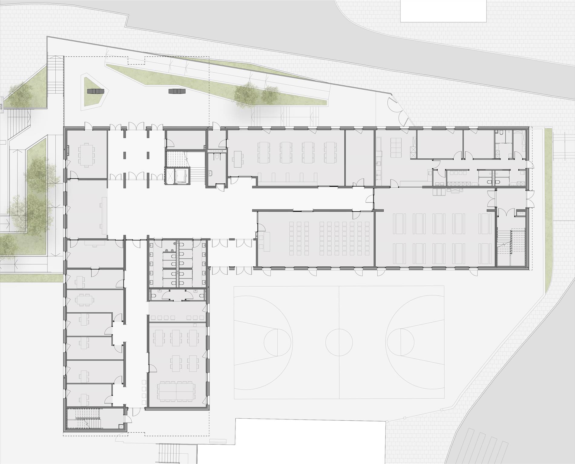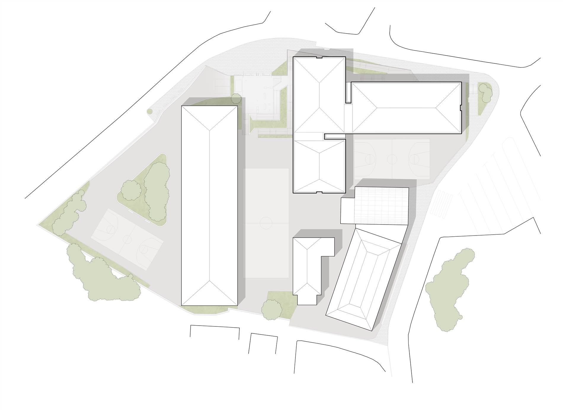 En este entorno de vagas referencias arquitectónica BAT Architecture propone un edificio cercano en el que la piel cerámica dialoga con el edifico escolar de ladrillo, pero su geometría y acabado cristalizado ofrece una imagen contemporánea que continua con la singular estructura de soporte y la construcción con madera que queda parcialmente vista en el interior.
