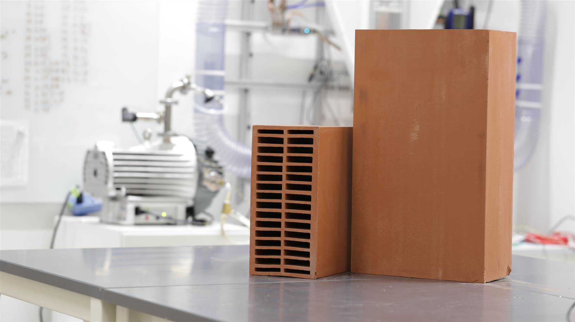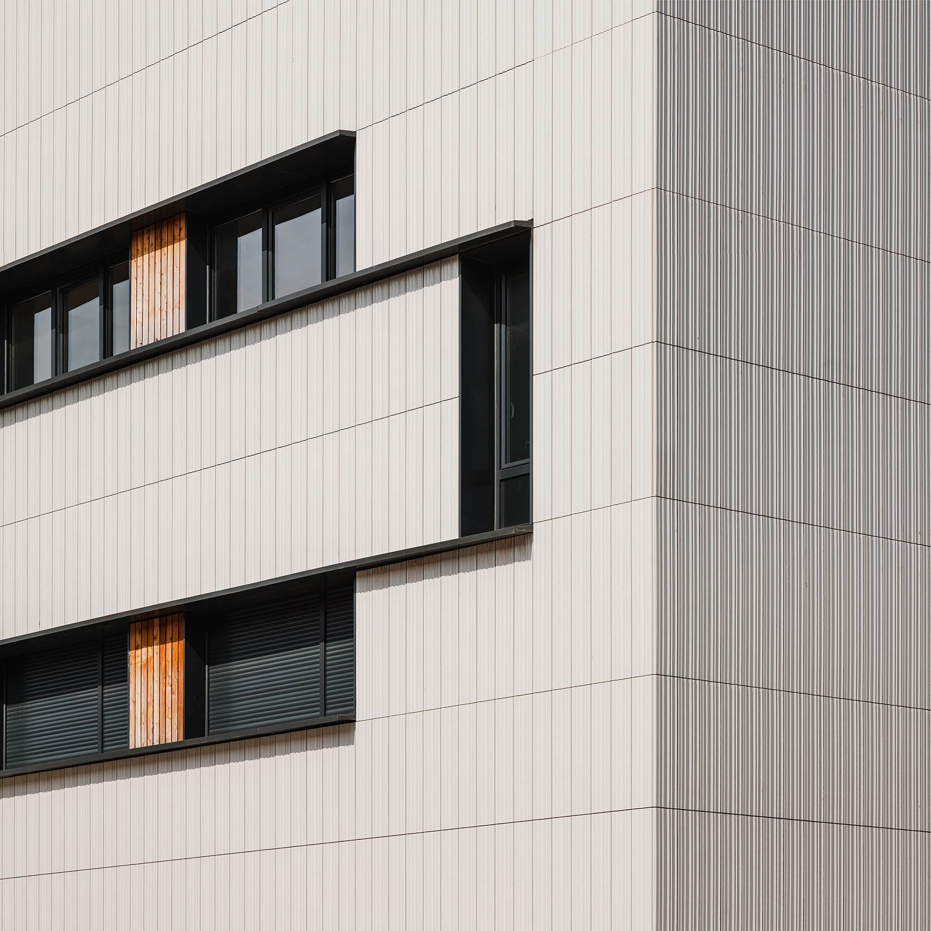 El revestimiento exterior se compone de piezas de gres porcelánico extrusionado de sección alveolar, obtenidas mediante un molde propio diseñado por el equipo de BAT para este proyecto. La geometría hueca de la pieza reduce el peso propio, mejora el comportamiento térmico del aplacado y aporta rigidez al conjunto, permitiendo luces y formatos que refuerzan la lectura unitaria de los volúmenes. La cara vista se somete a una cocción a alta temperatura que genera una superficie exterior casi cristalizada, de brillo contenido, capaz de captar y descomponer la luz natural a lo largo del día.