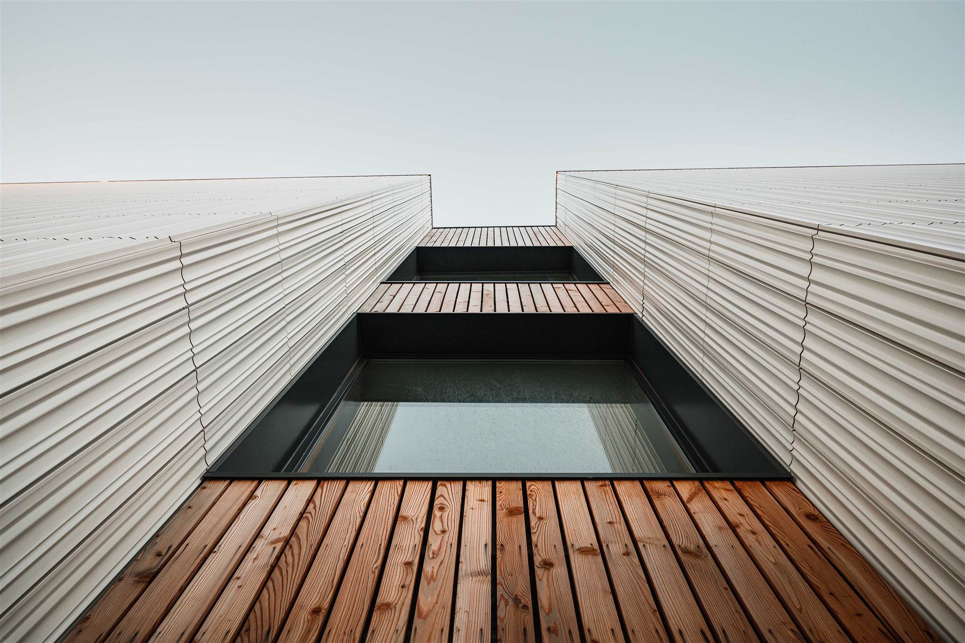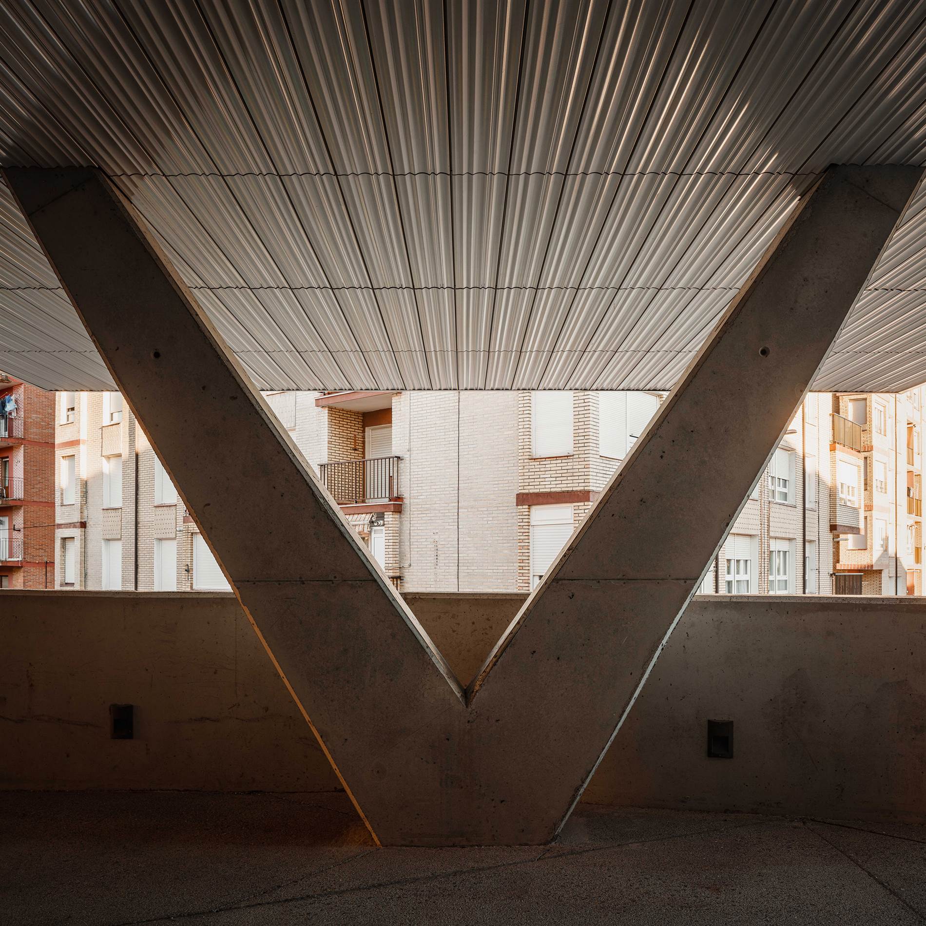 Esa piel cerámica incorpora un relieve longitudinal que enfatiza la verticalidad sobre un alzado esencialmente apaisado y remite, de forma abstracta, a los engatillados metálicos tradicionales, envolviendo también los techos de las zonas en sombra y los porches de acceso.