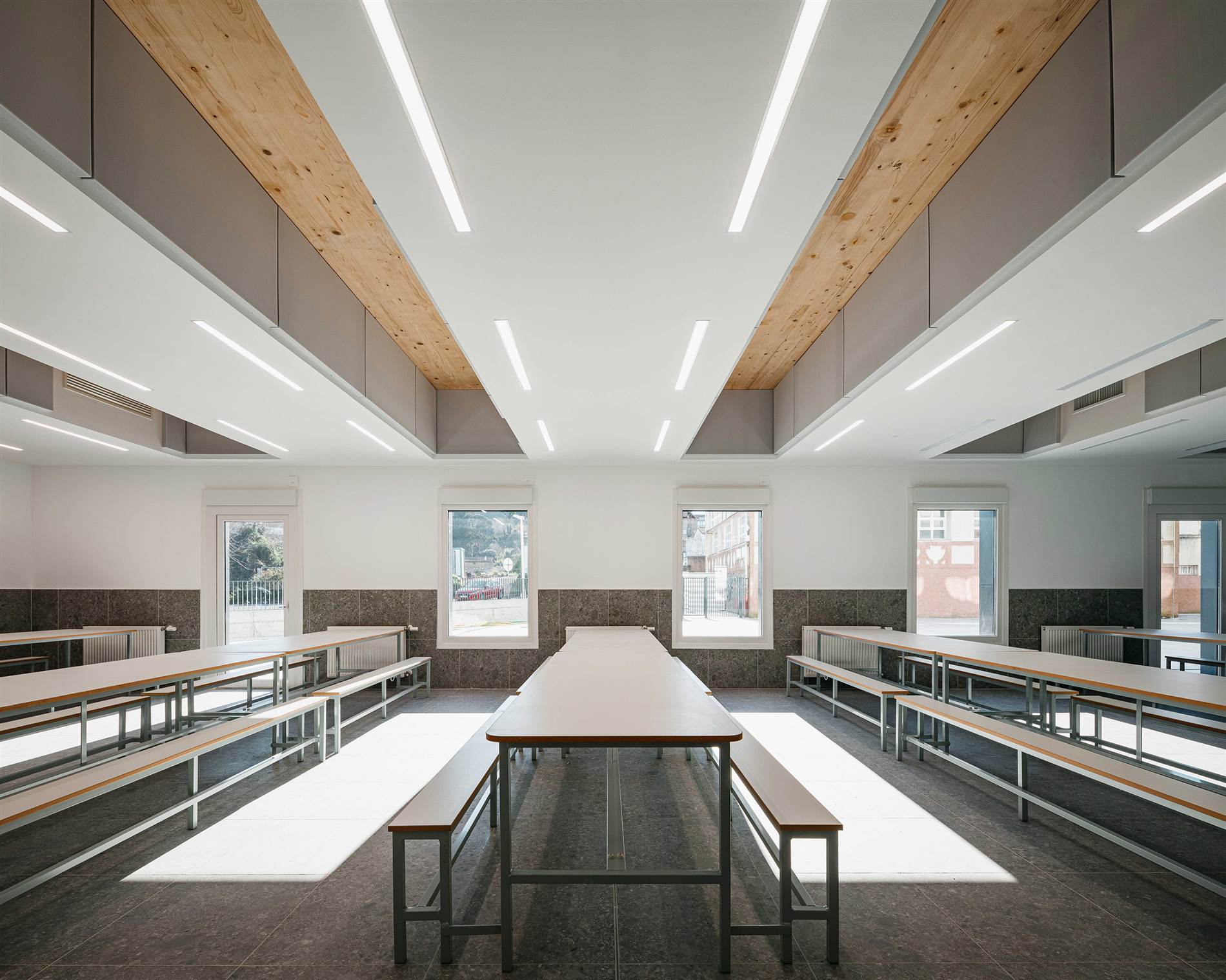 El nuevo instituto se organiza en dos volúmenes longitudinales que convergen en un espacio central presidido por una gran escalera abierta que articula la vida del centro; rótula que aumenta la entrada de luz natural en el espacio interior y facilita una ventilación cruzada. La estructura de madera contralaminada (CLT) ofrece ventajas térmicas, acústicas y medioambientales, con un importante ahorro de emisiones de CO₂ y un consumo energético hasta un 90% menor que un edificio convencional.