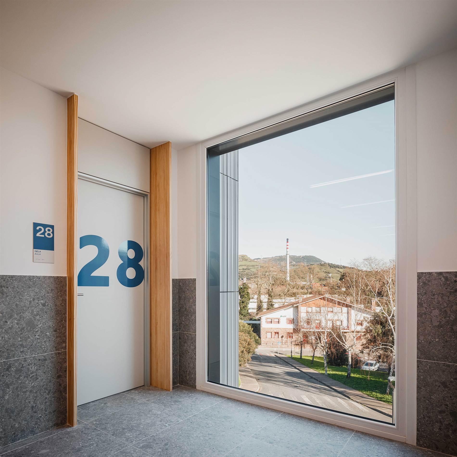 La ampliación del instituto de Muskiz resuelve su envolvente mediante una fachada ventilada cerámica desarrollada específicamente para el proyecto, en colaboración con Gres Aragón Faveker, que fabrica una pieza de porcelánico extruido diseñada ex profeso para este edificio, la pieza GA16 MUSKIZ. La solución busca aligerar la presencia volumétrica del conjunto y, al mismo tiempo, garantizar unas prestaciones térmicas compatibles con los requerimientos del estándar Passivhaus planteados en el concurso.