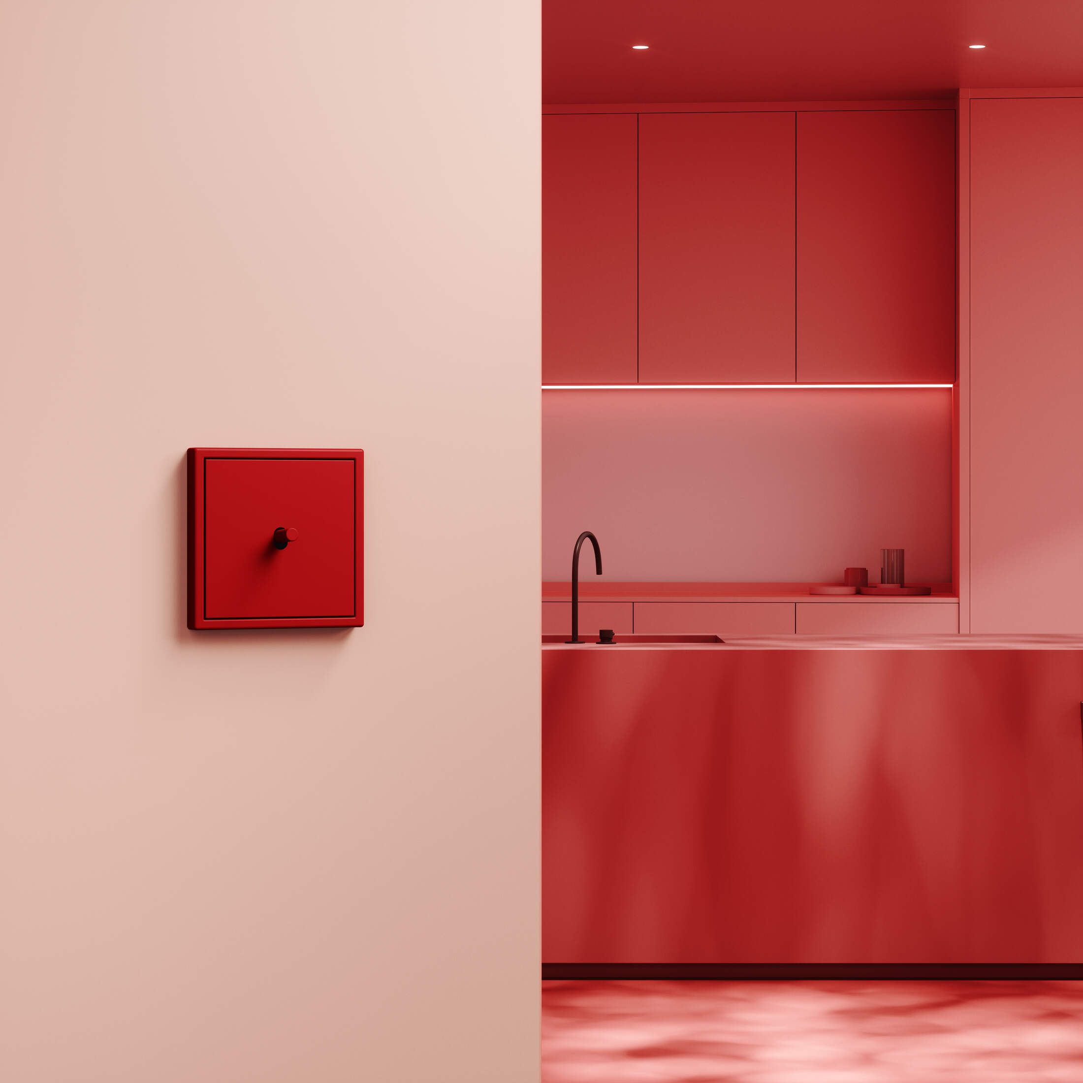 En estos espacios es en donde se hace más visible los sistemas de control domótico de la vivienda: en la columna central de la zona de estar se ha instalado el nuevo controlador inteligente LS TOUCH de JUNG, que controla la iluminación, la climatización, las persianas y estores motorizados. En el espacio de trabajo de la cocina se sitúan los mecanismos de la atemporal serie LS 990 en color 32110 l'ocre rouge, de la colección Les Couleurs® Le Corbusier de JUNG, y, destacando por su discreción, en uno de los laterales de la isla se coloca un teclado F 50 instalado a ras de superficie, característica esencial de la serie de diseño LS ZERO.