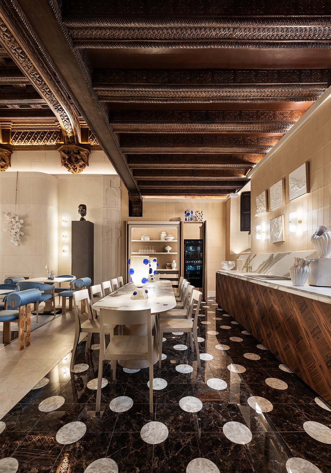 El restaurante "The Silent Chapel" es la propuesta del estudio de Raúl Martins, para Iris Ceramica Group. El interiorista destaca la arquitectura original de la capilla del edificio respetando los elementos históricos, como un espectacular lucernario de cristal y el artesonado de madera de los techos.