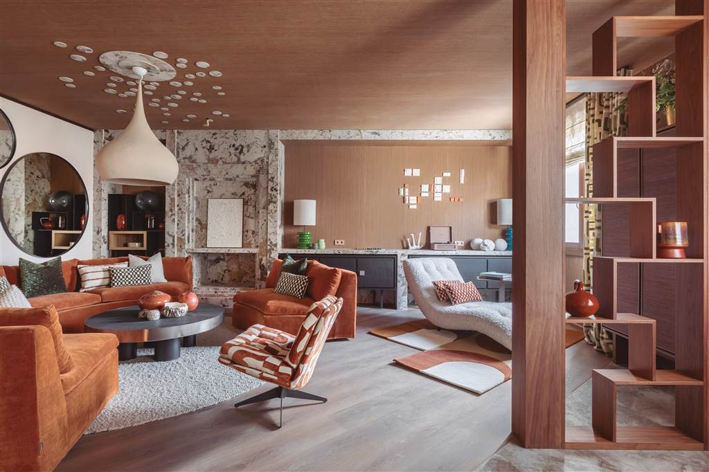 S de Studio diseña el salón comedor "La vie, chez nous” para PH Collection. El diseño se inspira en la estética de los años setenta para crear un ambiente de relajación, con maderas y textiles envolventes que se combinan con patrones geométricos y tonos naranjas y verdes.