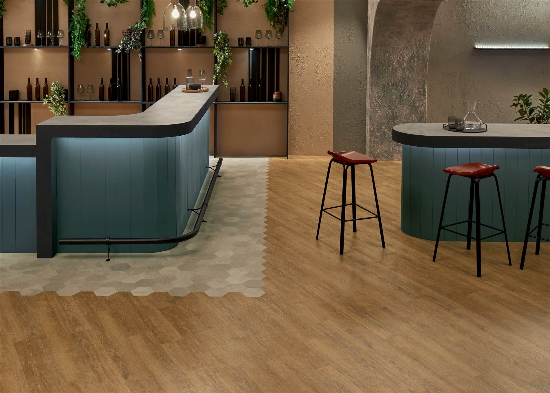 Todas las soluciones de moqueta pueden instalarse combinadas con la gama de pavimentos LVT de Amtico.