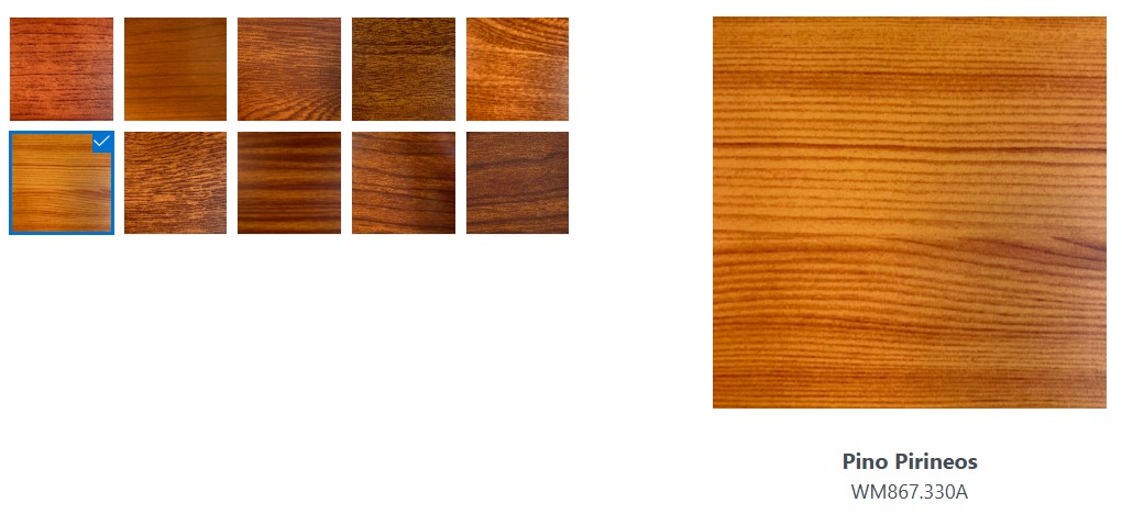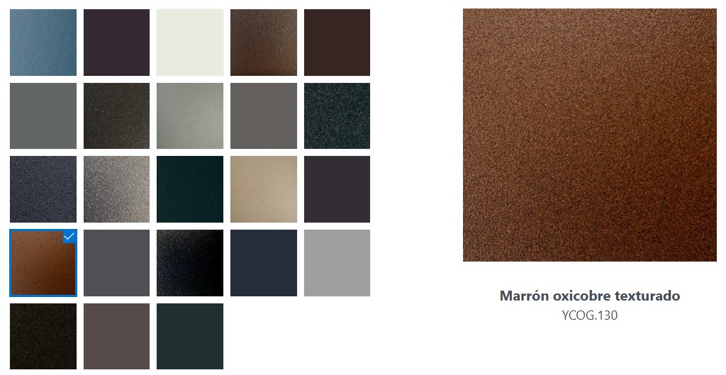 Las lamas de aluminio están acabadas con revestimiento en polvo de poliéster (QUALICOAT) en 19 colores estándar, 12 acabados texturados, 8 lacados anódicos, 23 acabado exclusivos; y en 10 lacados efecto madera.