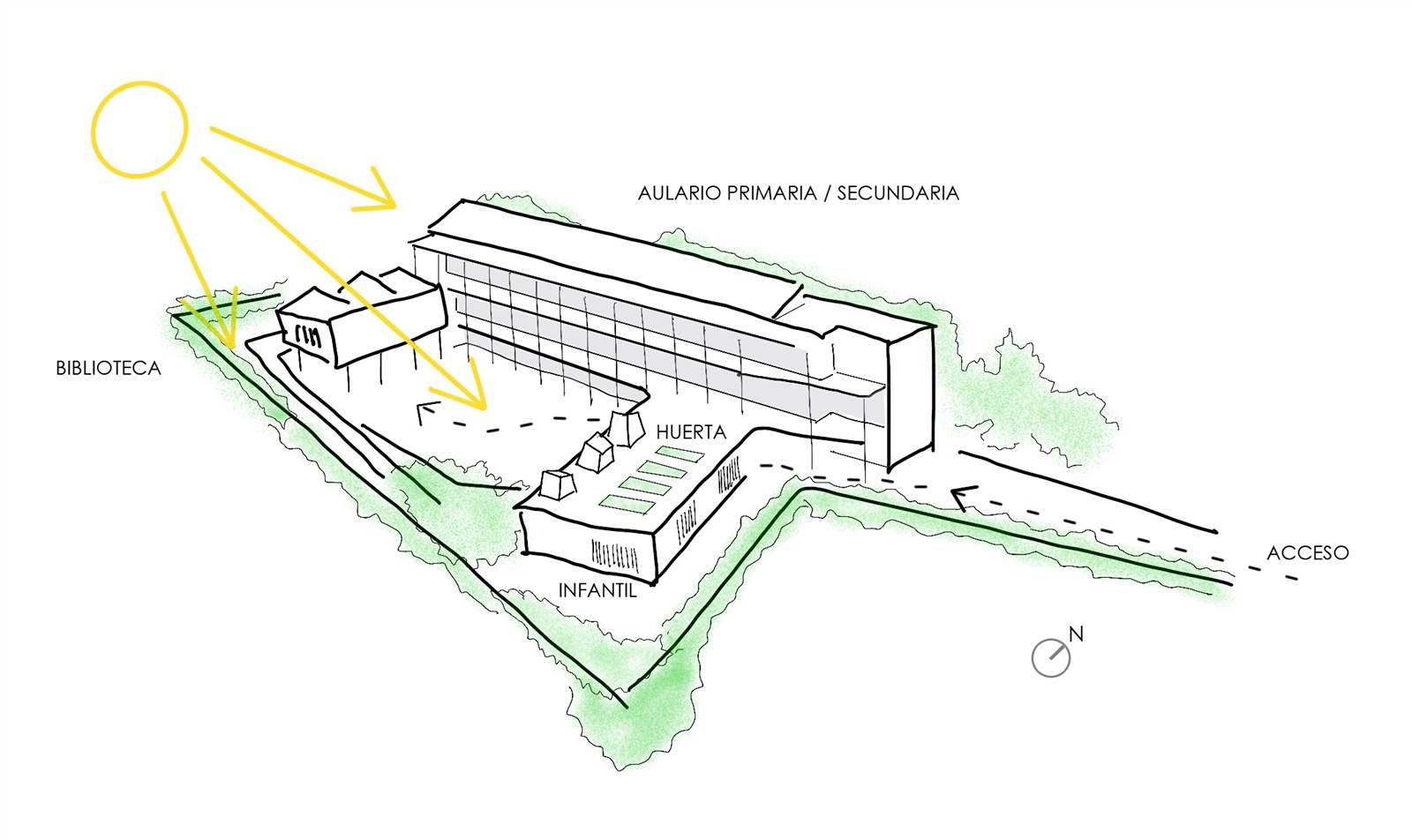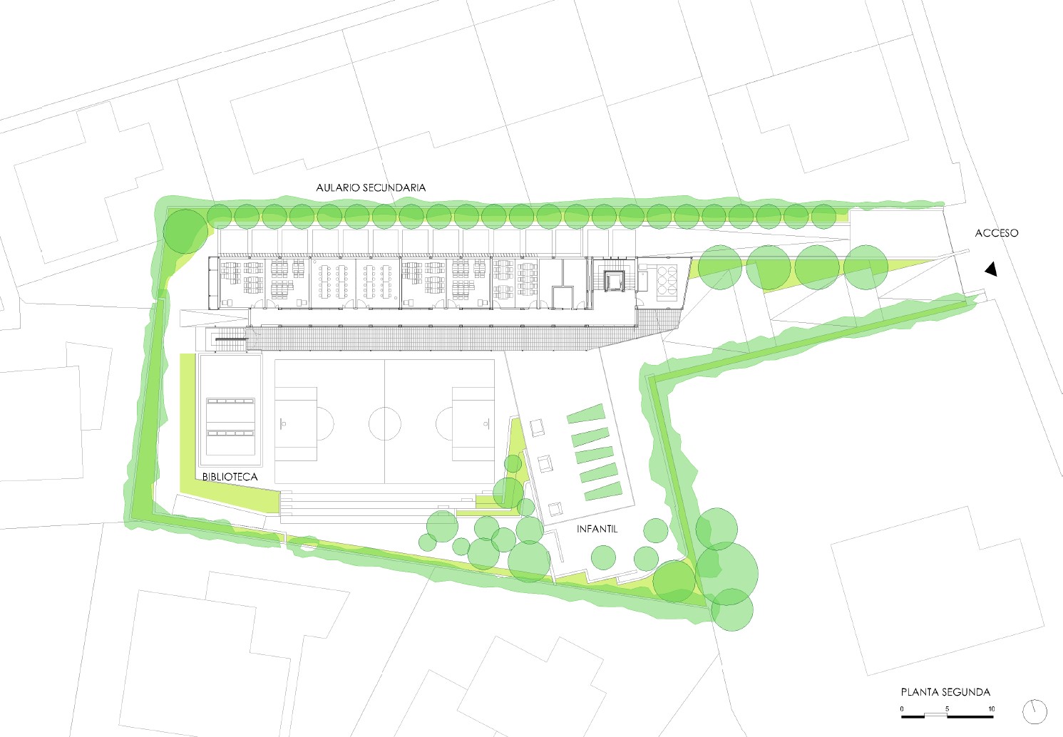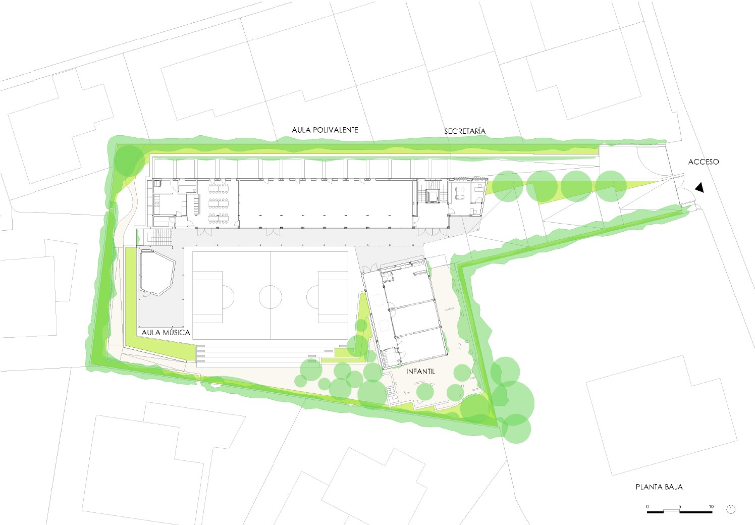 AJ: Cuando nos hicieron el encargo, lo primero que vimos fue que el solar era realmente endiablado por muchas razones. La primera era que es una parcela para una o dos viviendas unifamiliares, de dimensiones reducidísimas para los requisitos que teníamos: un colegio de una línea, que significa una clase por cada curso de infantil, primaria y secundaria.