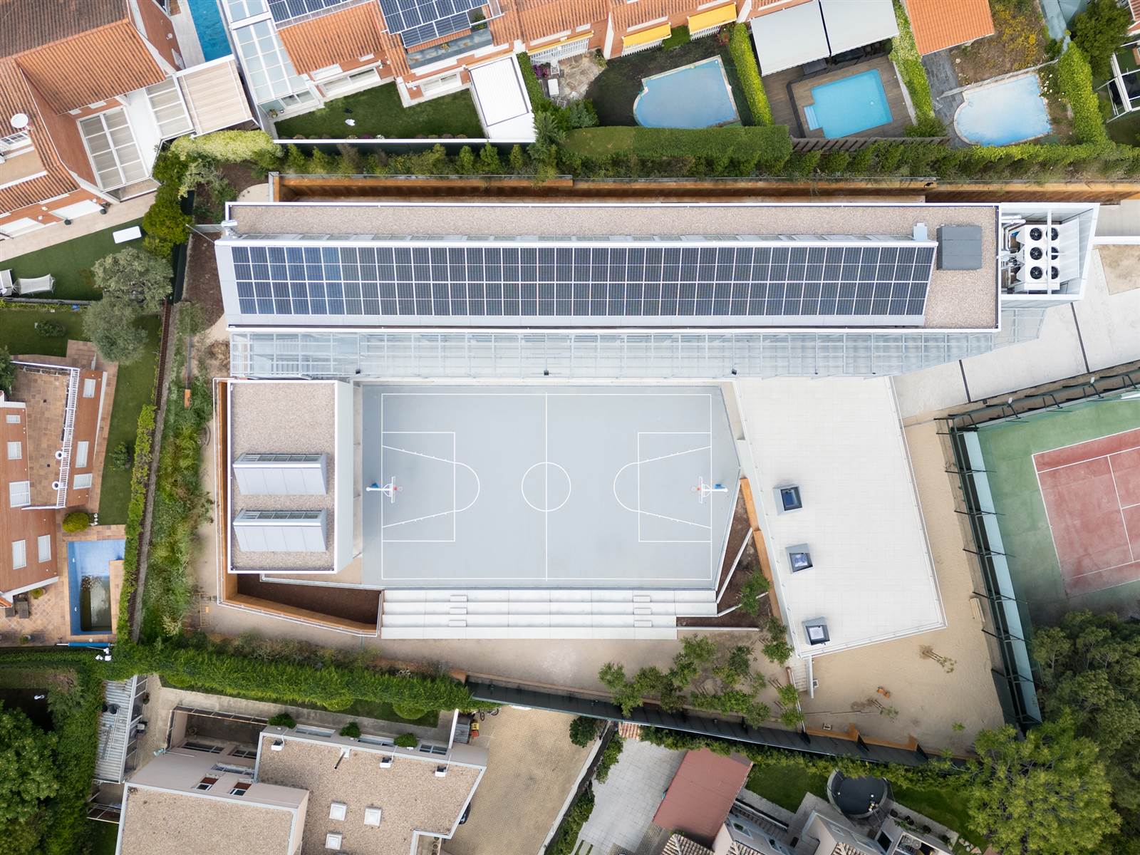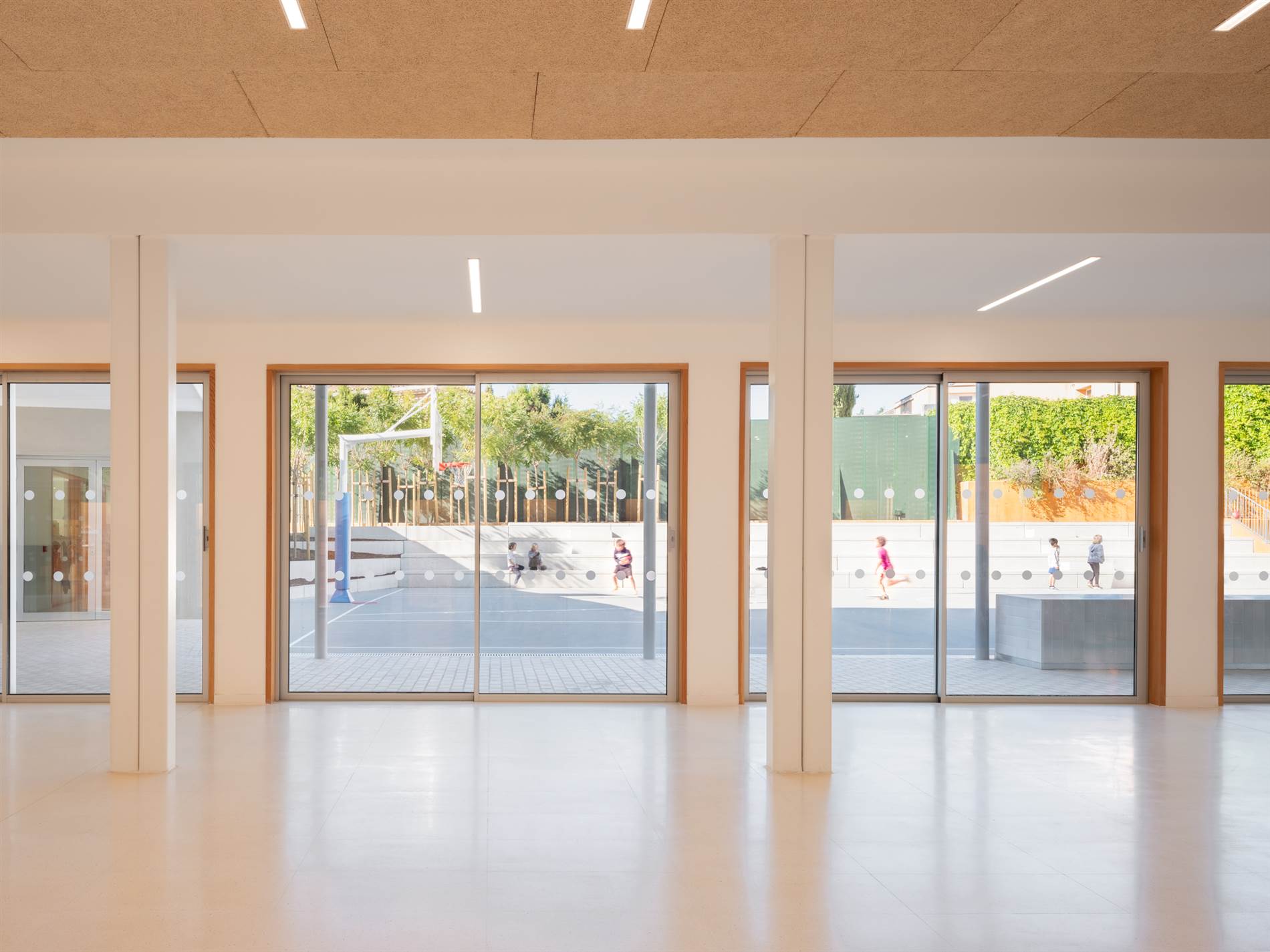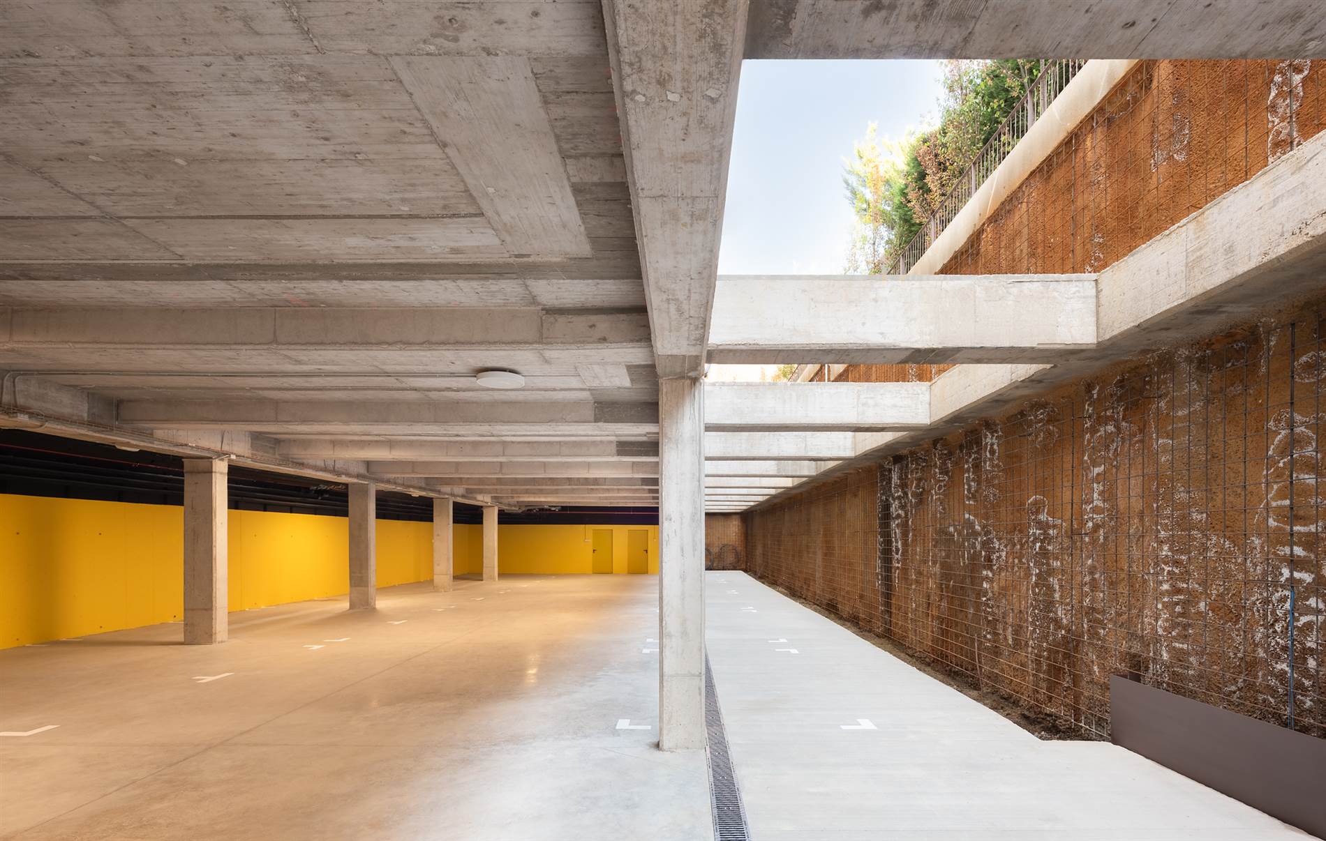 En el espacio inicialmente destinado a aparcamiento también se ha dejado una jardinera continua para plantar y crear un jardín vertical. Como no se necesita aparcamiento para el día a día del colegio, se utiliza este espacio como zona de juego y ejercicio, a cubierto en invierno, y en verano, es delicioso con una ventilación natural cruzada que se forma al pasar el aire a través de las rejillas colocadas bajo los bancos situados frente a la pista deportiva.