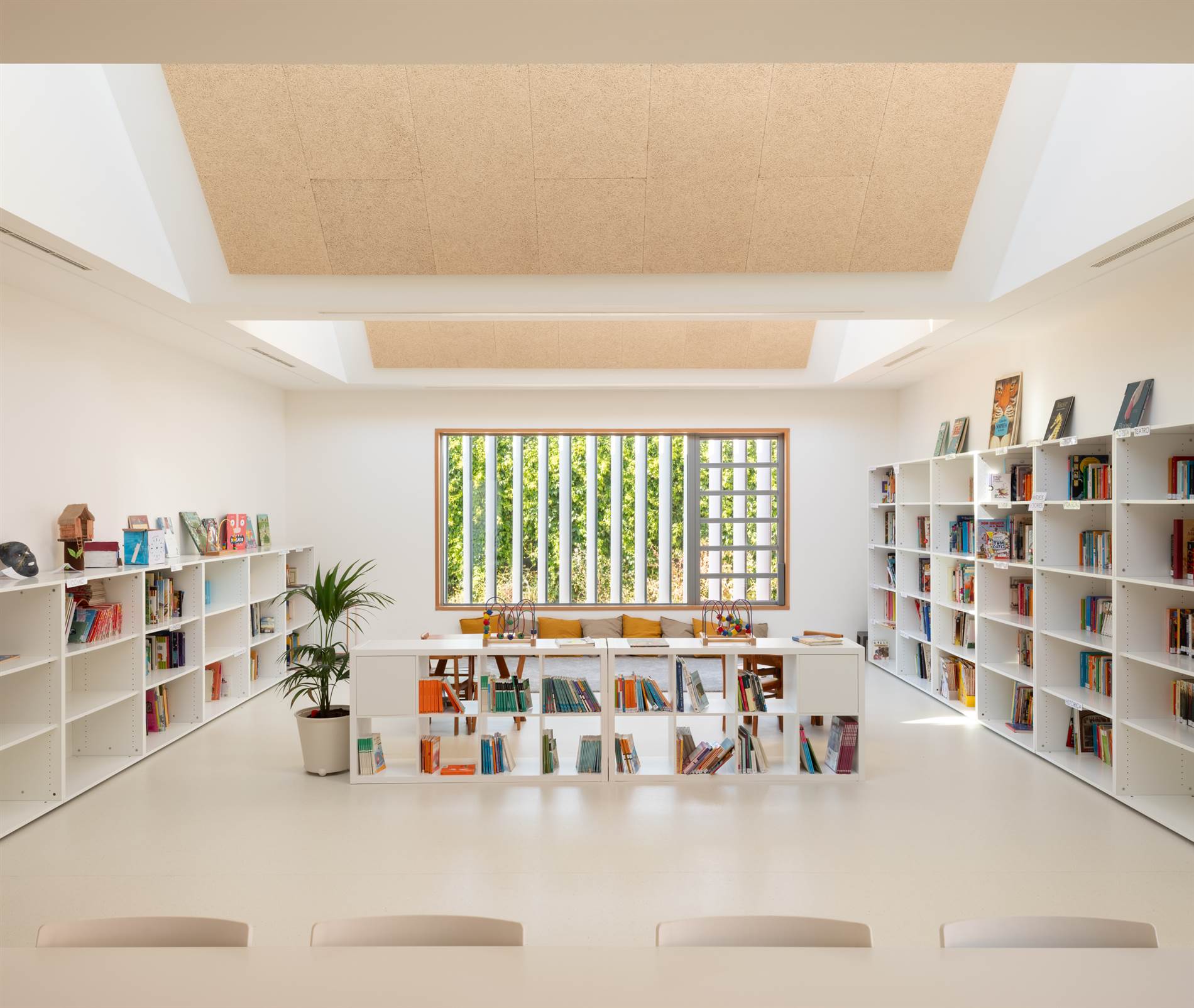 AJ: Encontramos que la mejor solución era hundir el edificio. De esta manera, al salir al espacio central de la pista deportiva, se ven apenas las cubiertas de las viviendas contiguas y la sensación es que te abrazan los volúmenes de la biblioteca con el porche que tiene debajo, e infantil, y se disfruta de un espacio soleado orientado a sur.