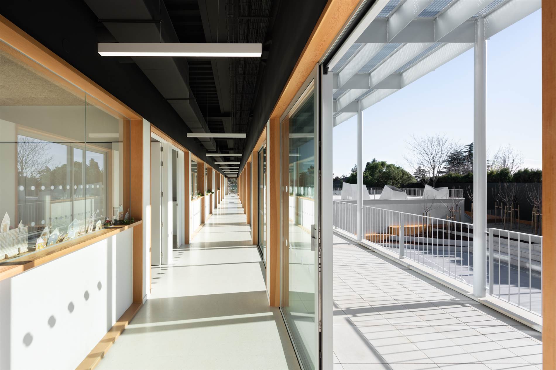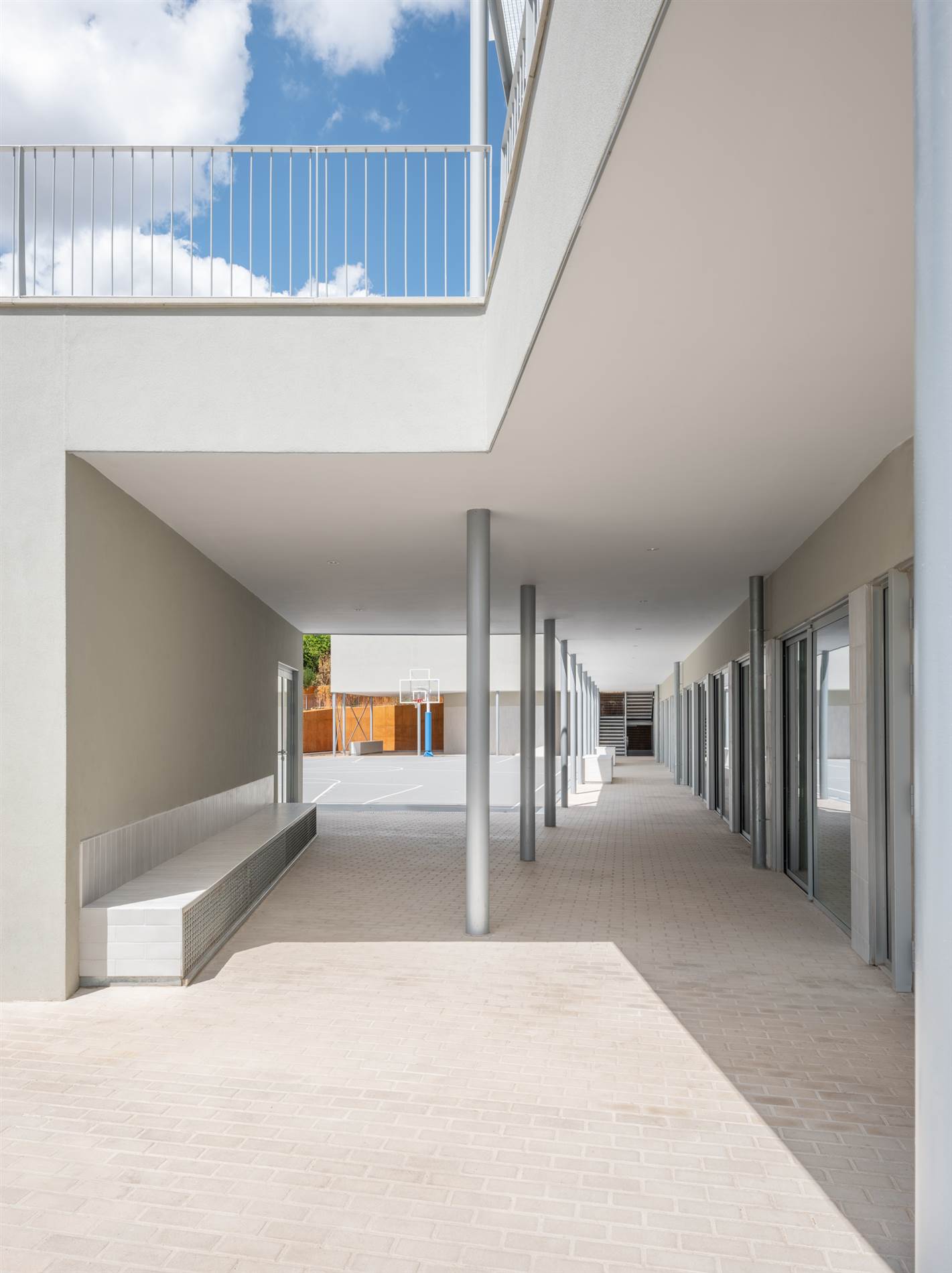 AJ: Claro. Lo que hemos hecho ha sido poner una estructura y colocado un Tramex, que hace como de control solar y filtro de luz hacia los pasillos de planta baja, pero podría ser el mismo esquema que en planta baja. A nosotros nos hubiera gustado mucho más que este pasillo fuera como los del Colegio Estudio original, que son unos pasillos generosos donde realmente hay mucha actividad, que de alguna manera lo hemos conseguido ampliándolo con el exterior.