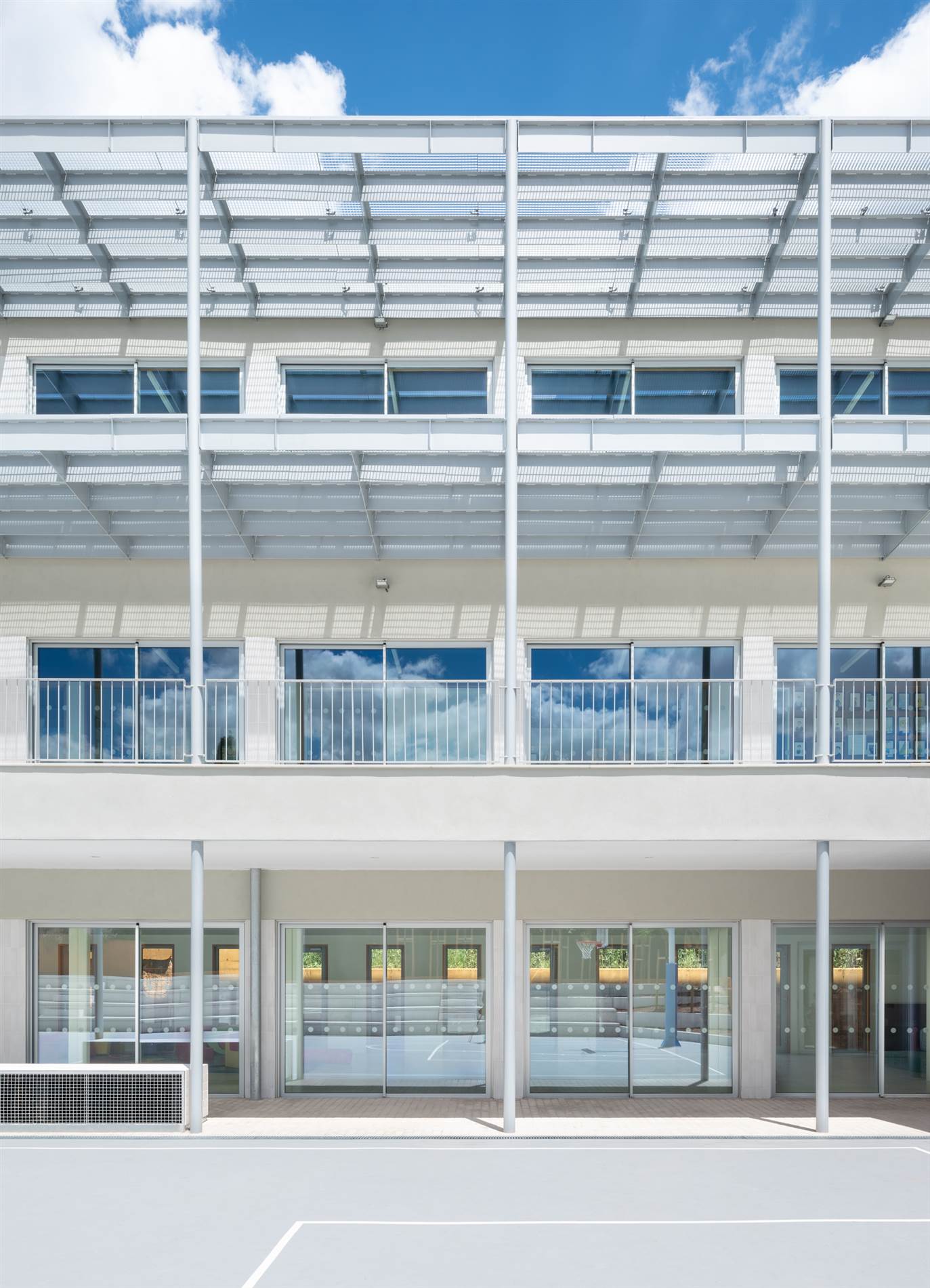 JJ: Y luego, también resolvimos la relación con los vecinos hacia el norte con una fachada prácticamente opaca, con unos brise-soleils protegiendo las vistas hacia fuera y de afuera hacia el colegio, separando la construcción con un patio inglés y proponiendo el parking, que exigía la ordenanza, como un sitio de juegos protegido, tanto para la lluvia, como frente al calor del verano.