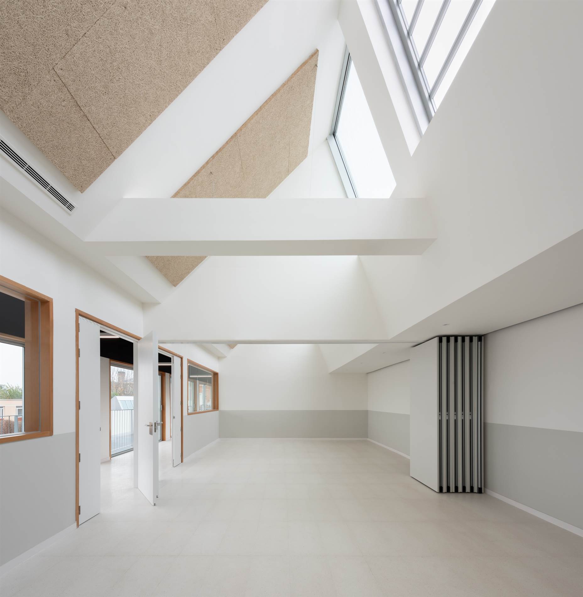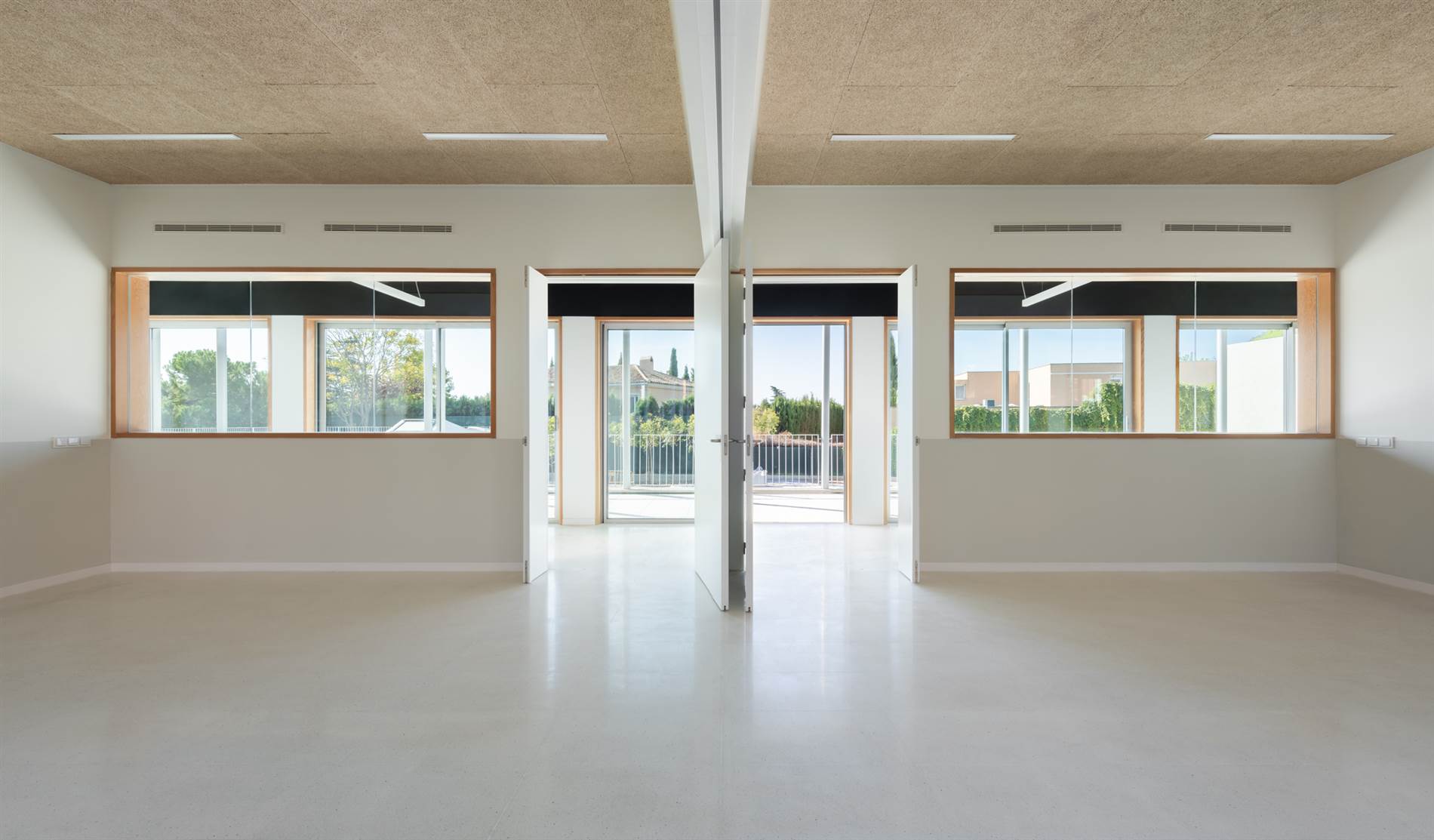 AJ: Es solo ventilación. Tiene suelo radiante refrigerante, pero sí se utiliza parte de la ventilación para atemperar en determinados momentos. Utilizamos la sección de los falsos techos para meter la impulsión por rejillas que se sitúan sobre la pared que da al pasillo orientado al sur, y hacer el retorno por plenum junto a la fachada norte.