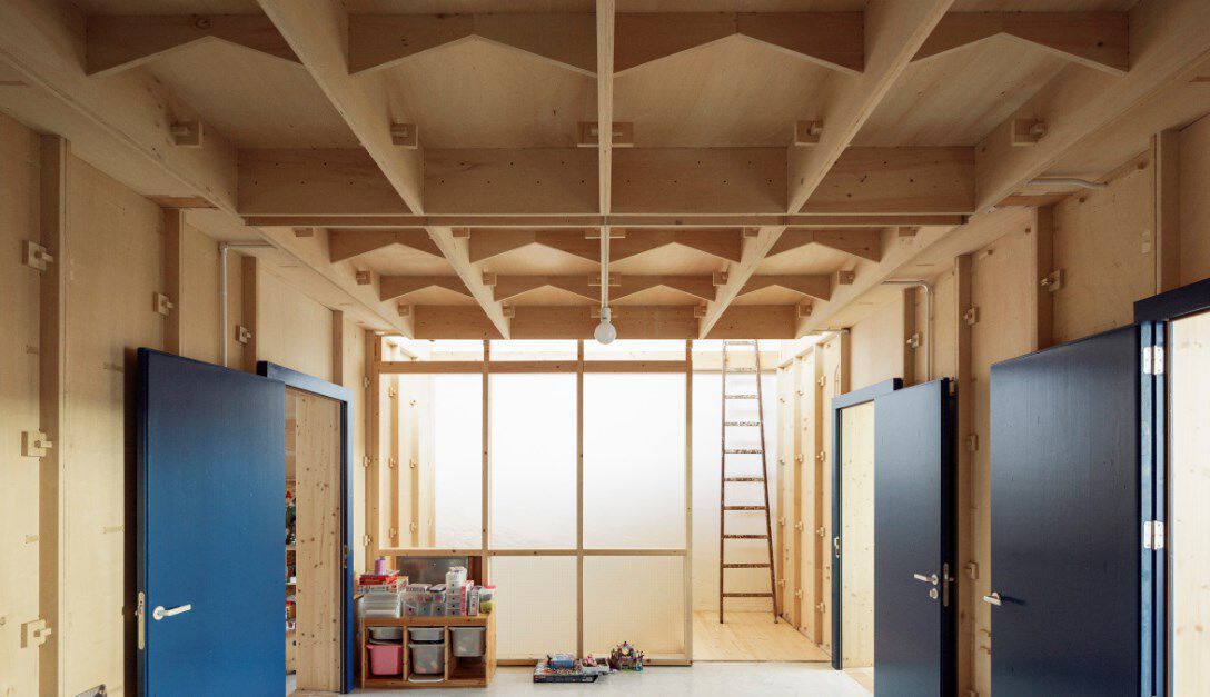 Vigas de madera estándar, separadas cada 60 cm, se cruzan en dos direcciones para construir el espacio entre los dos muros, formados por doble hoja de bloque con cámara interior.