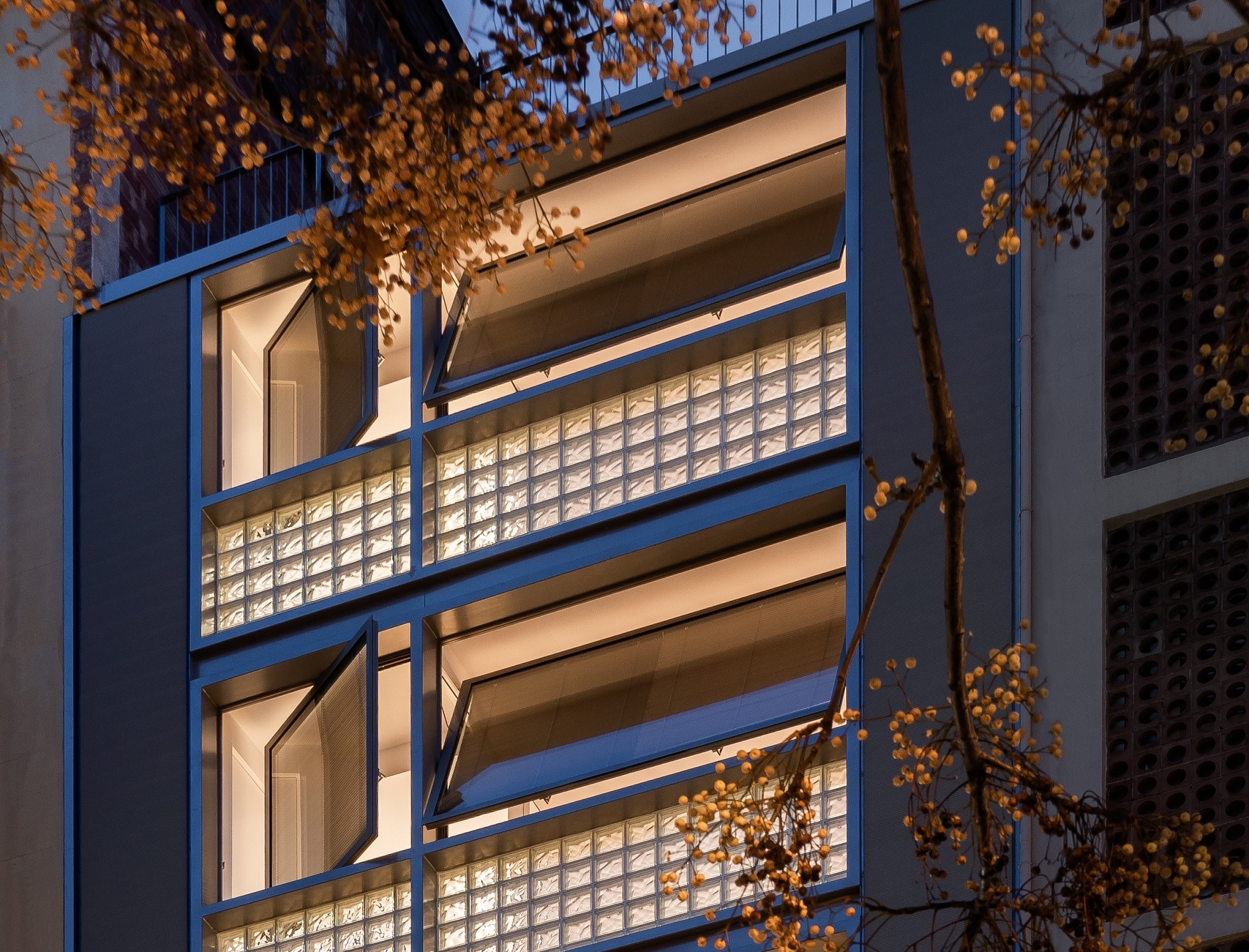 Detalle de las carpinterías y paneles micronervados de aluminio. Fotografía (fragmento): Aldo Amoretti