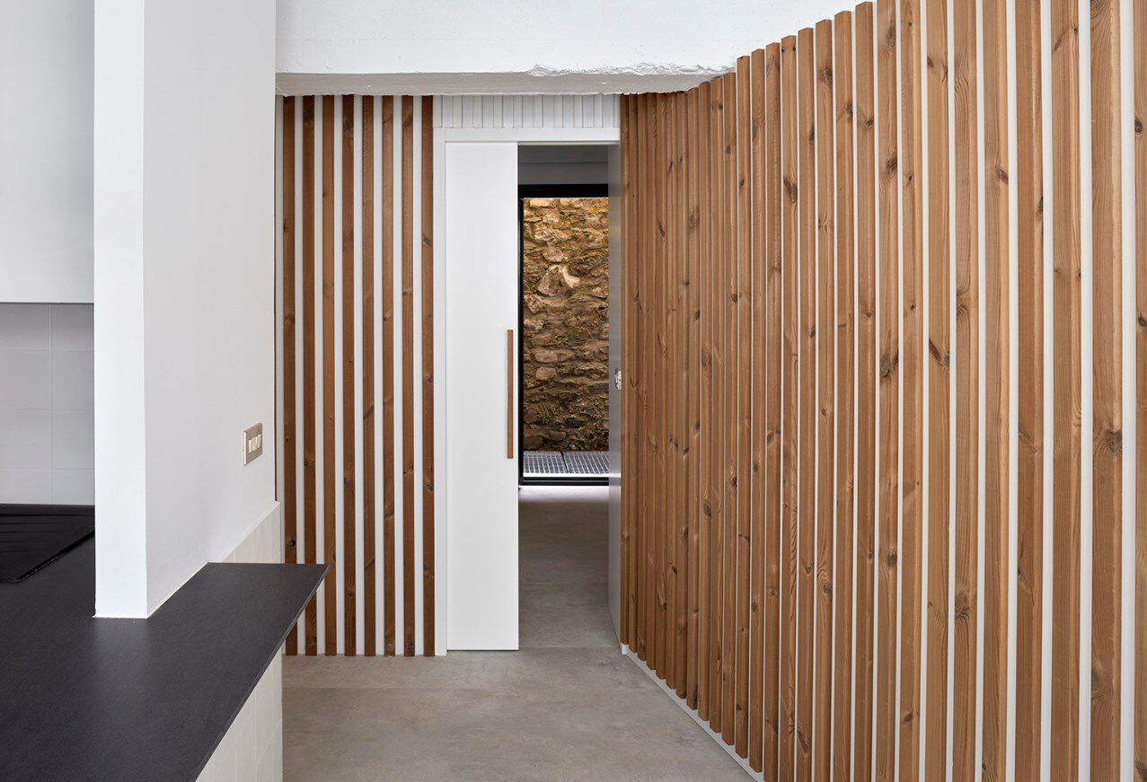 El resto de la vivienda se deja prácticamente intacta. Se recuperan los suelos, techos y carpinterías que se conservaban en buen estado para establecer así un cuidado contraste con el mueble de servicios. Un contraste que aúna tanto las dos direcciones del chaflán, como los dos tiempos de intervención en la historia de la vivienda.