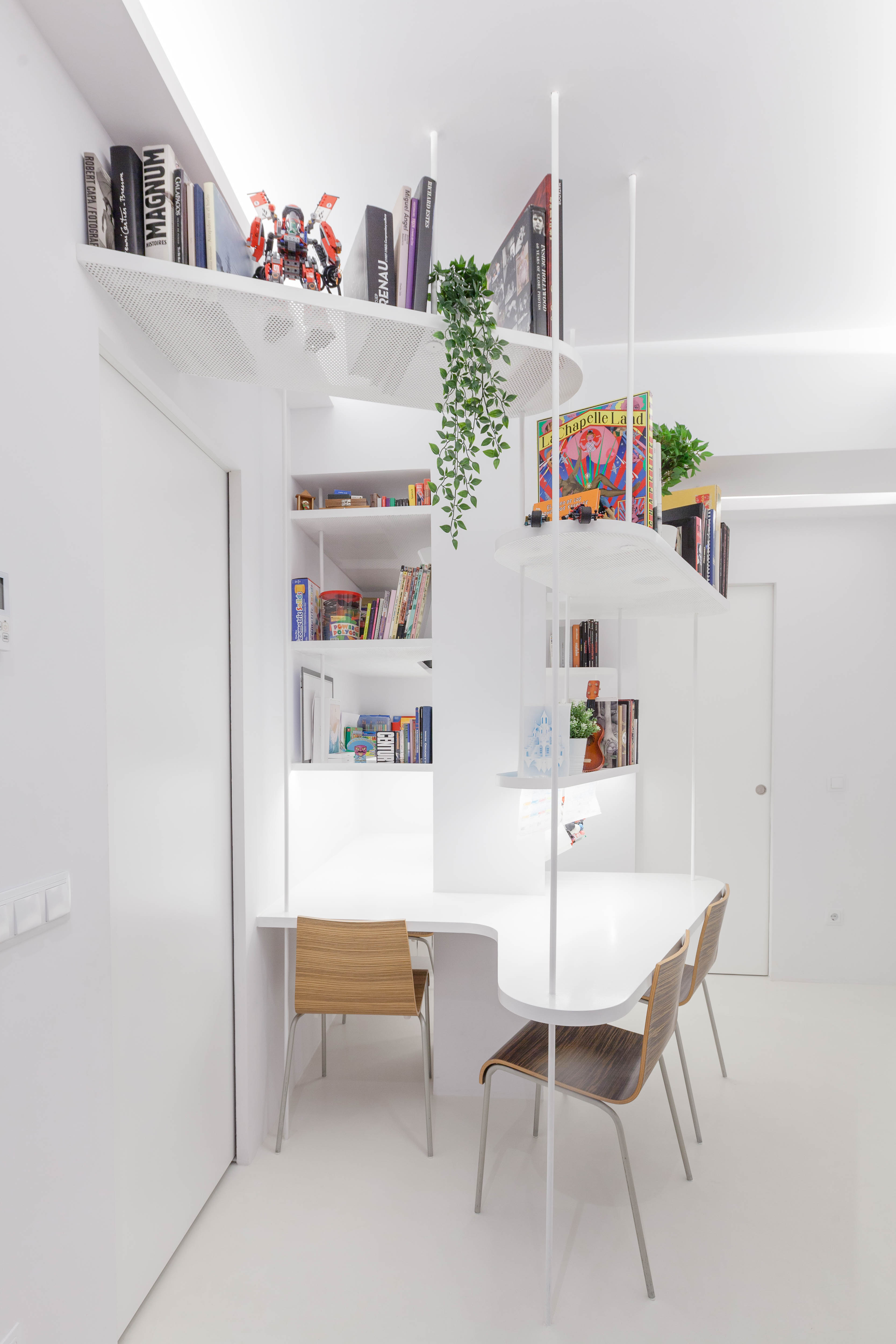Para lograr tal flexibilidad, la propuesta concentra todos los servicios en un único volumen, como si de un mueble se tratara, que atraviesa las estancias principales siguiendo la directriz a 45º propia de las viviendas en situación de chaflán. Este mueble permite alojar la cocina y el baño, así como en la parte superior, un altillo que funcionará como almacén cuando el espacio sea un estudio, y como dormitorio/juegos para los futuros nietos cuando vengan de visita.